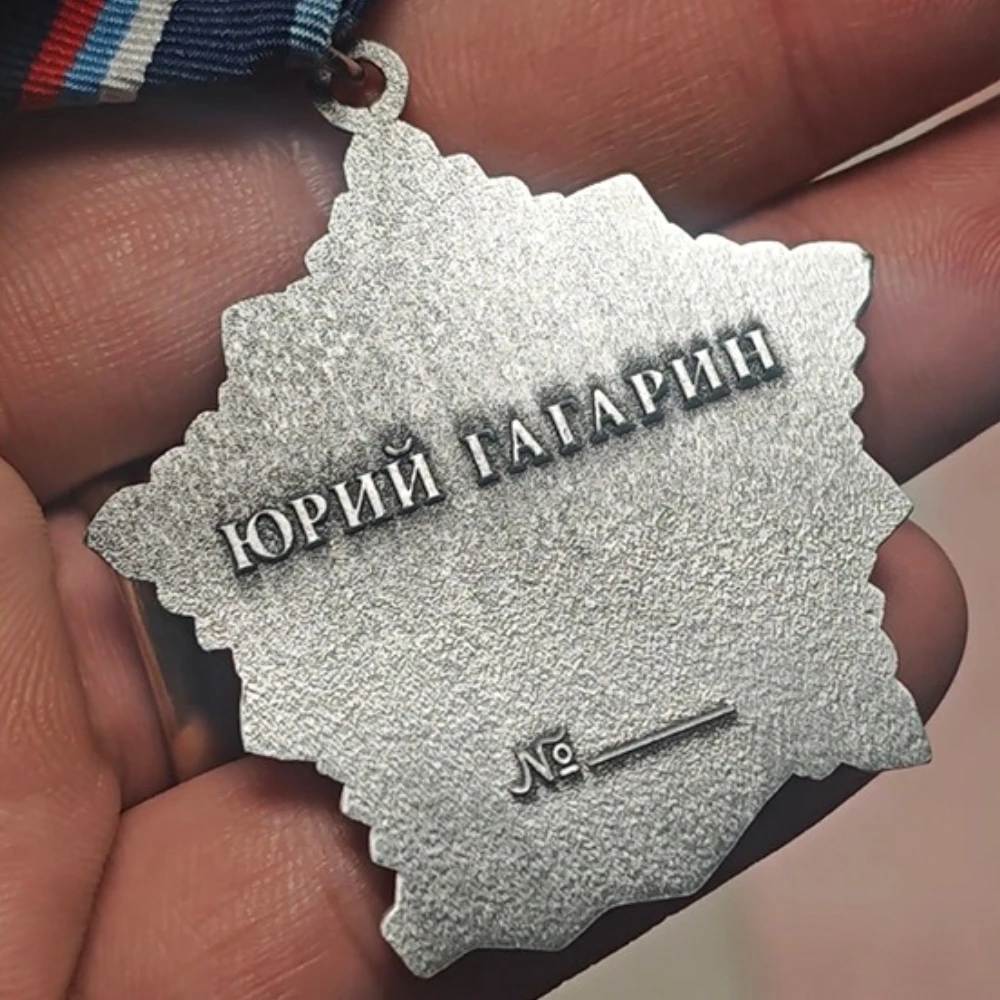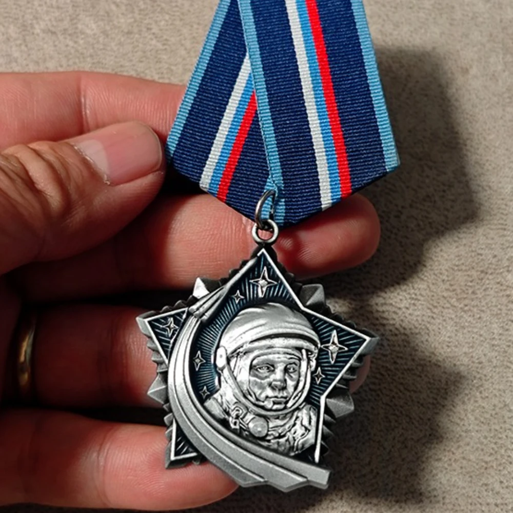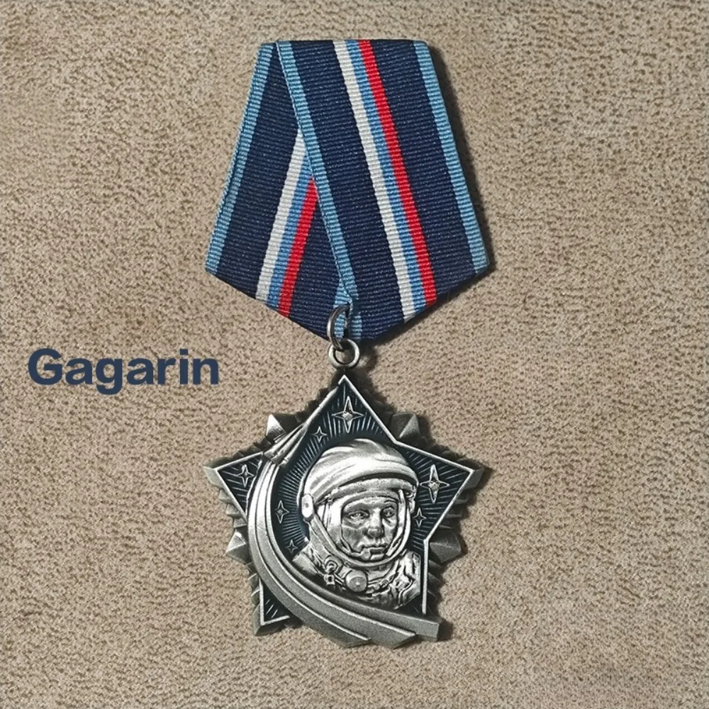Imagine owning this beautifully crafted medal that pays tribute to Yuri Gagarin, the legendary Soviet cosmonaut. Featuring a detailed relief of Gagarin’s face in a space helmet, it captures the pioneering spirit of space exploration. The medal's star-shaped outline with pointed edges gives it a striking and distinguished appearance, perfect for display or collection. The background showcases a crescent moon and a starry sky motif, emphasizing the theme of cosmic achievement. The accompanying ribbon, in navy blue with vertical stripes of light blue, white, and red, enhances its formal and nostalgic feel. With its vintage craftsmanship, this medal is more than a collectible—it's a symbol of courage and human progress you can proudly own.