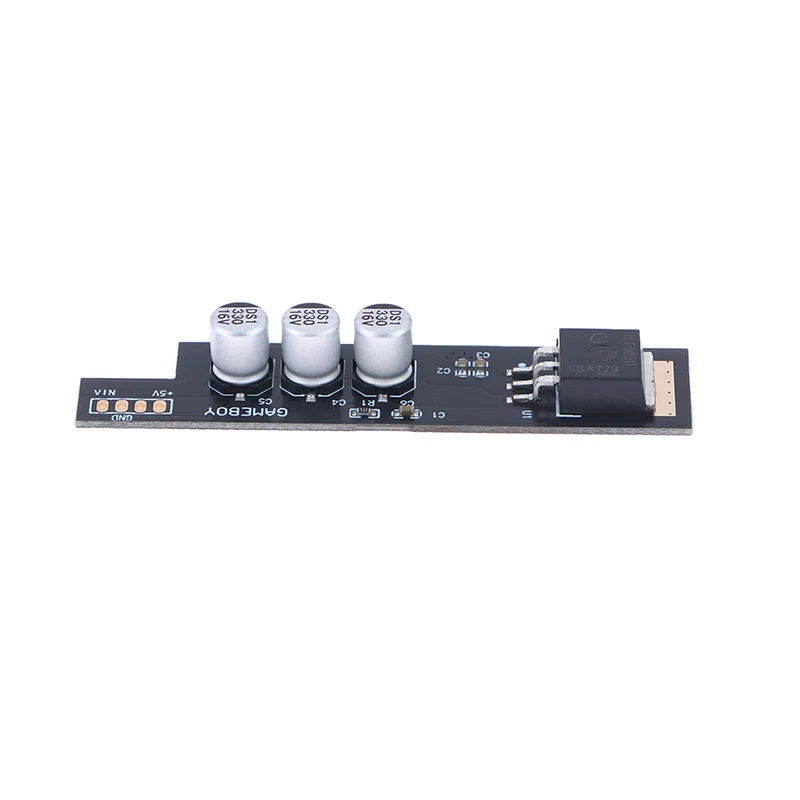 Enhance your Game Boy GB DMG experience with this high-quality power module board adapter, designed to deliver a stable 5V power supply optimized for high-brightness IPS LCD screens (not compatible with original screens). It features premium aluminum capacitors that help reduce speaker static noise, ensuring clear audio, and offers efficient power management for maximum brightness and stable operation. Compatible with LiPo (two batteries) and AA batteries, this module includes a USB port for easy connectivity. Its sleek, black rectangular design is organized with gold contact pads and surface-mounted components, making it an ideal upgrade for customized, high-performance Game Boy consoles.