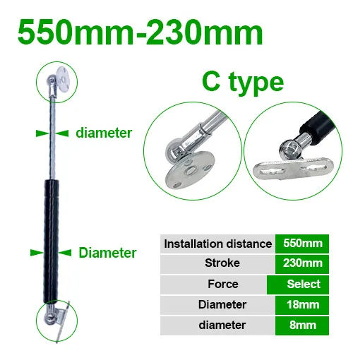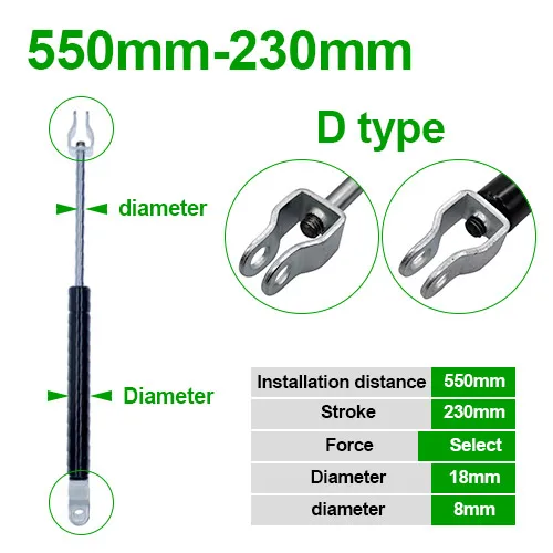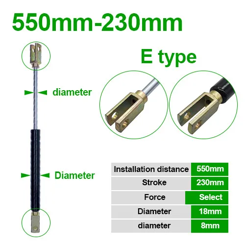 Imagine elevating your projects with this sleek, modern gas spring folding hinge, designed to combine functionality with aesthetic appeal. Its slim, metallic cylindrical rod features a smooth matte black finish, giving it a clean and professional look suitable for a variety of applications. The distinct mounting components—ranging from eyelets to flanges and angular brackets—offer flexibility for different installation needs. With force options from 50N to 500N and a stroke distance of 230mm, this hinge provides reliable support for lifting and holding objects securely. Its streamlined design ensures seamless integration into furniture, cabinets, or industrial equipment, making your setup safer and more user-friendly. Elevate your craftsmanship today with this durable and stylish component.