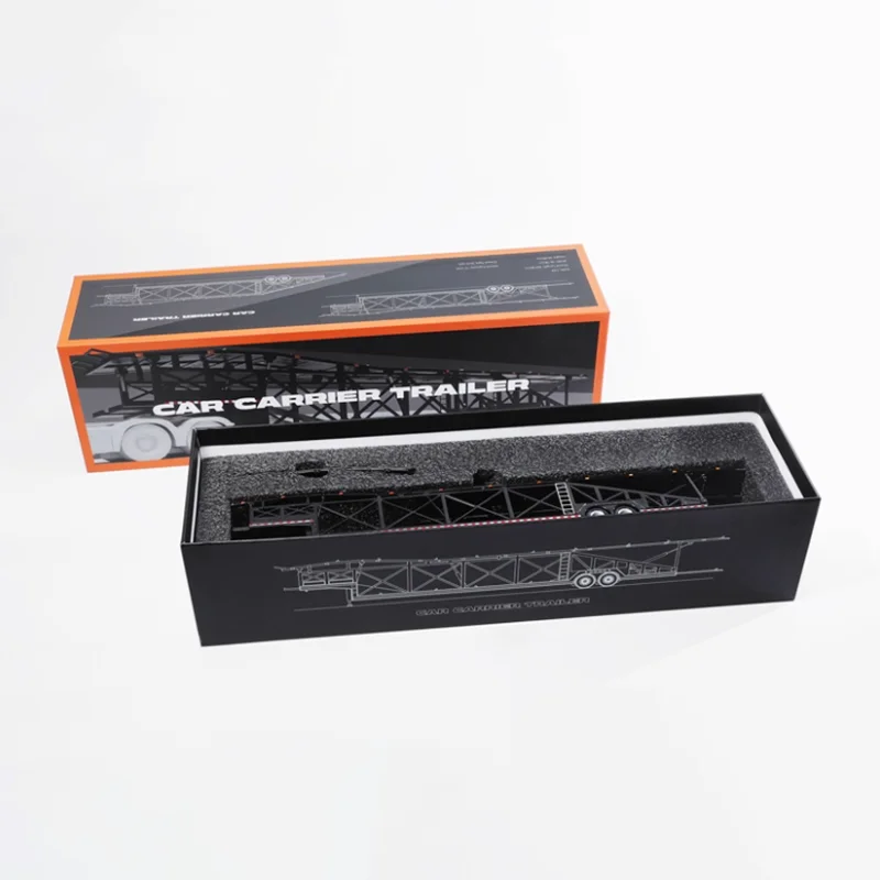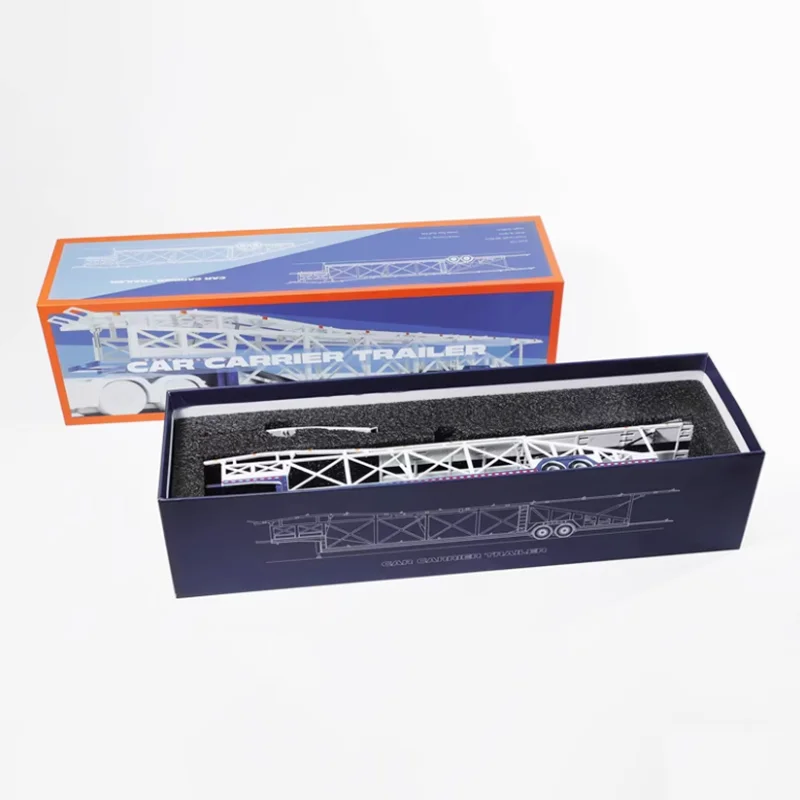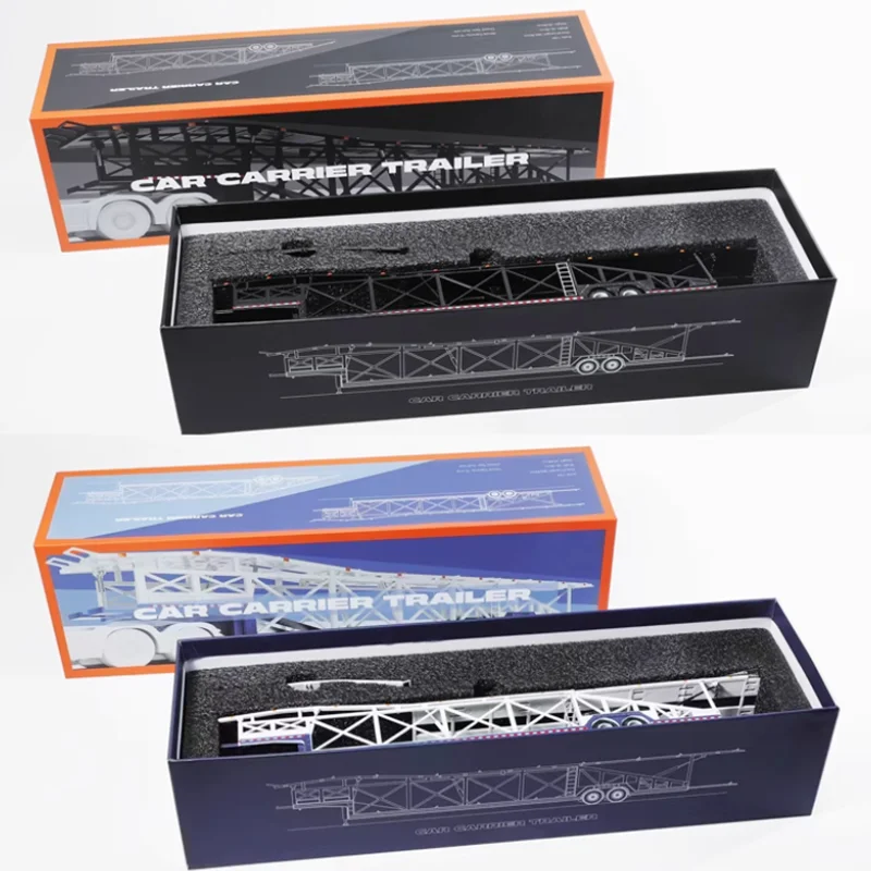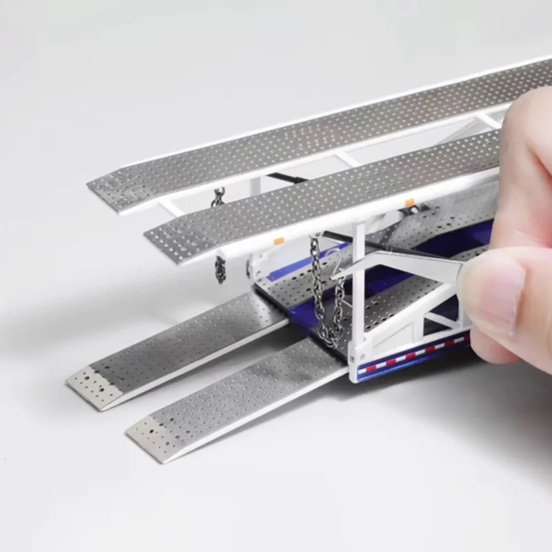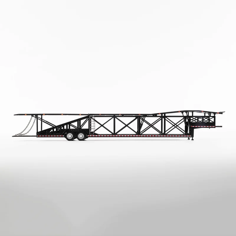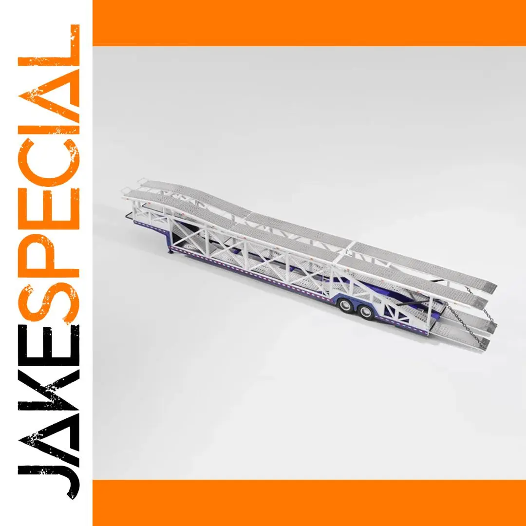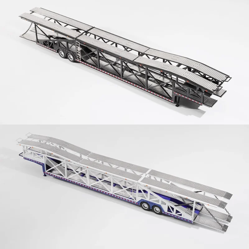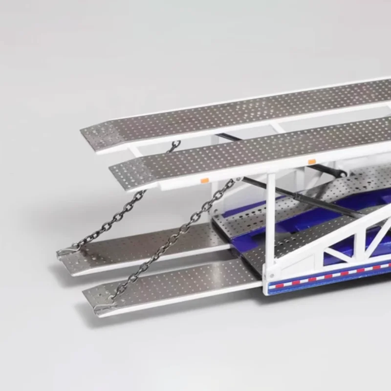 Discover this detailed 1/64 scale diecast car transporter trailer, crafted from alloy with rubber and plastic components, perfect for display and collection. It features a sleek, white multi-level structure with lattice side frameworks, a textured non-slip upper deck, and realistic black rubber tires with detailed rims. The trailer showcases an articulated front ramp, subtle blue and red accents along the base, and structural support beams underneath for added realism. Designed as a static collectible without moving parts or electronic features, it offers durability and intricate detailing that captures the essence of real-life transporters, making it an ideal addition for enthusiasts and collectors alike.