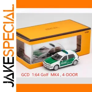 Experience the realism of the GCD 1:64 scale alloy diecast model of the Volkswagen Golf MK4 4-door, crafted from durable metal for adult collectors and enthusiasts. This meticulously detailed miniature features vibrant green and black accents, a glossy white finish, and a striking blue police light bar on the roof. The model showcases realistic multi-spoke rims, clear windows revealing an intricate interior, and precise design elements including “POLIZEI” lettering on the sides and green hood accents. Available in colors KS031222, KS031223, and KS031224, this compact display piece captures the essence of the iconic police vehicle with exceptional craftsmanship and attention to detail.