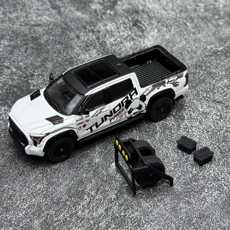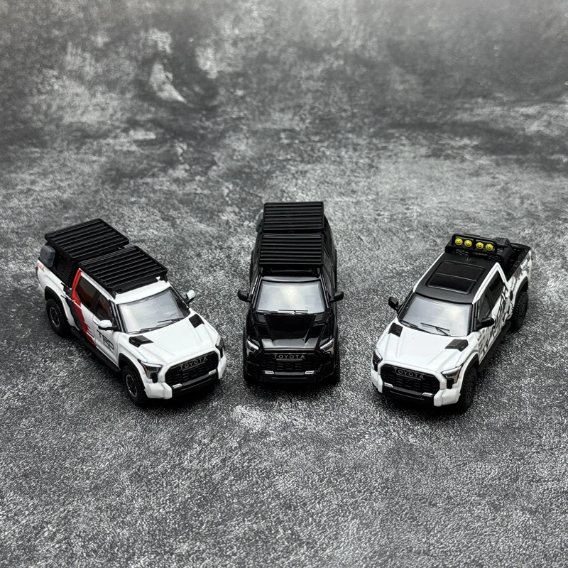 Indulge in the exquisite craftsmanship of the GCD 1:64 Tundra MK3 XK70 TRD Pro Pickup diecast model car collection. Each model spans 8 cm in length and showcases stunning details, from rugged grills to eye-catching graphics. The collection features a striking white Toyota Tundra with bold black “TUNDRA” lettering and lights atop its roof rack. Another white variant incorporates flashy red accents with “TRD” lettering, while the entirely black model exudes an aggressive demeanor. Made from durable alloy and plastic, these models are perfect for both display and play, capturing the essence of this iconic vehicle.