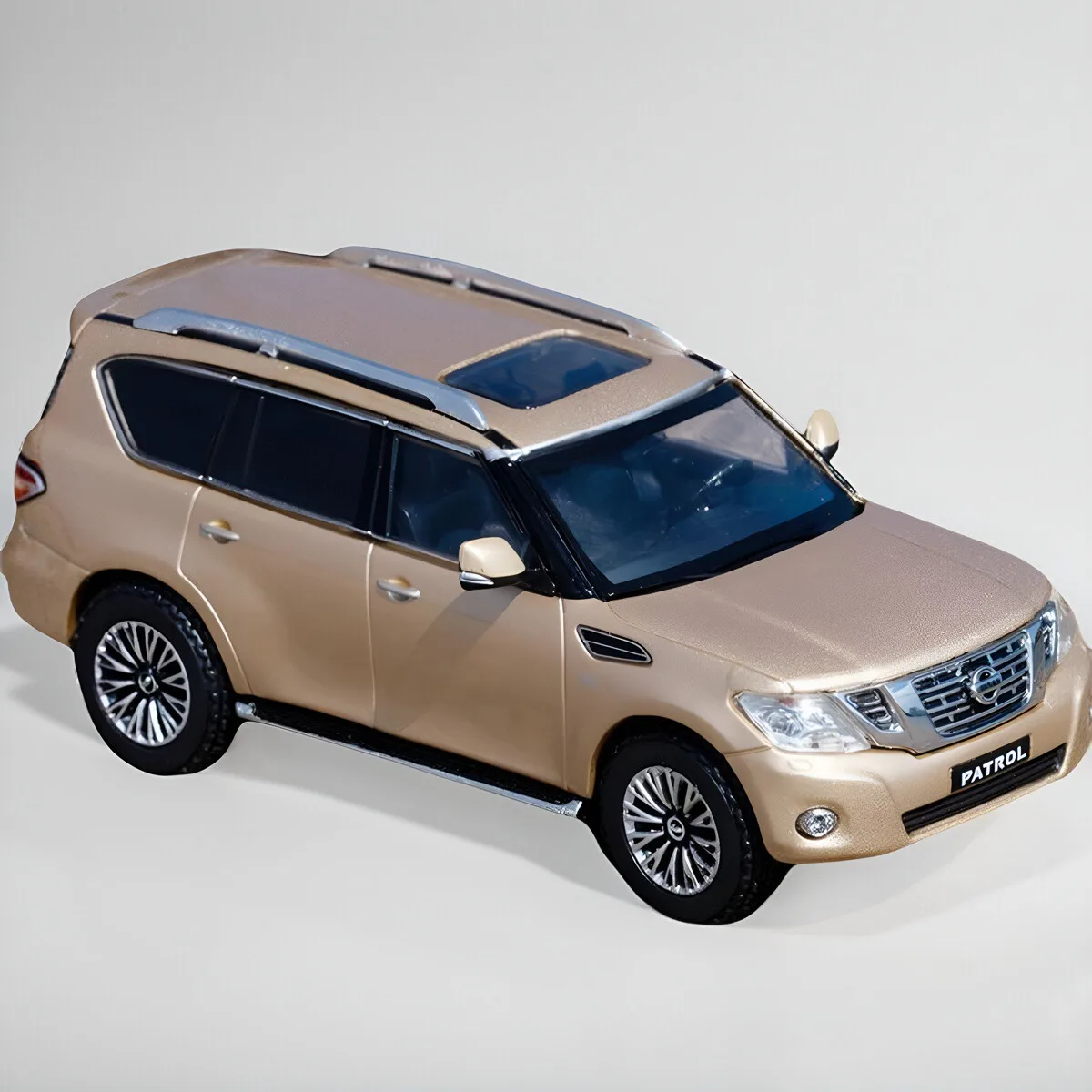 The GCD Cars 1/64 Scale Nissan Patrol Y62 Off-road Vehicle is a stunning diecast model that showcases two exquisite variants. One model is finished in a luxurious metallic gold, while the other shines in a sleek metallic silver. Both vehicles are crafted with meticulous attention to detail, accurately reflecting the iconic contours and design features of the actual Nissan Patrol Y62. These models feature defined headlights, a prominent grille, a realistic sunroof, and stylish wheels. Constructed from durable metal, alloy, and plastic, they are perfect for display and collection purposes, appealing to automotive enthusiasts and collectors alike.