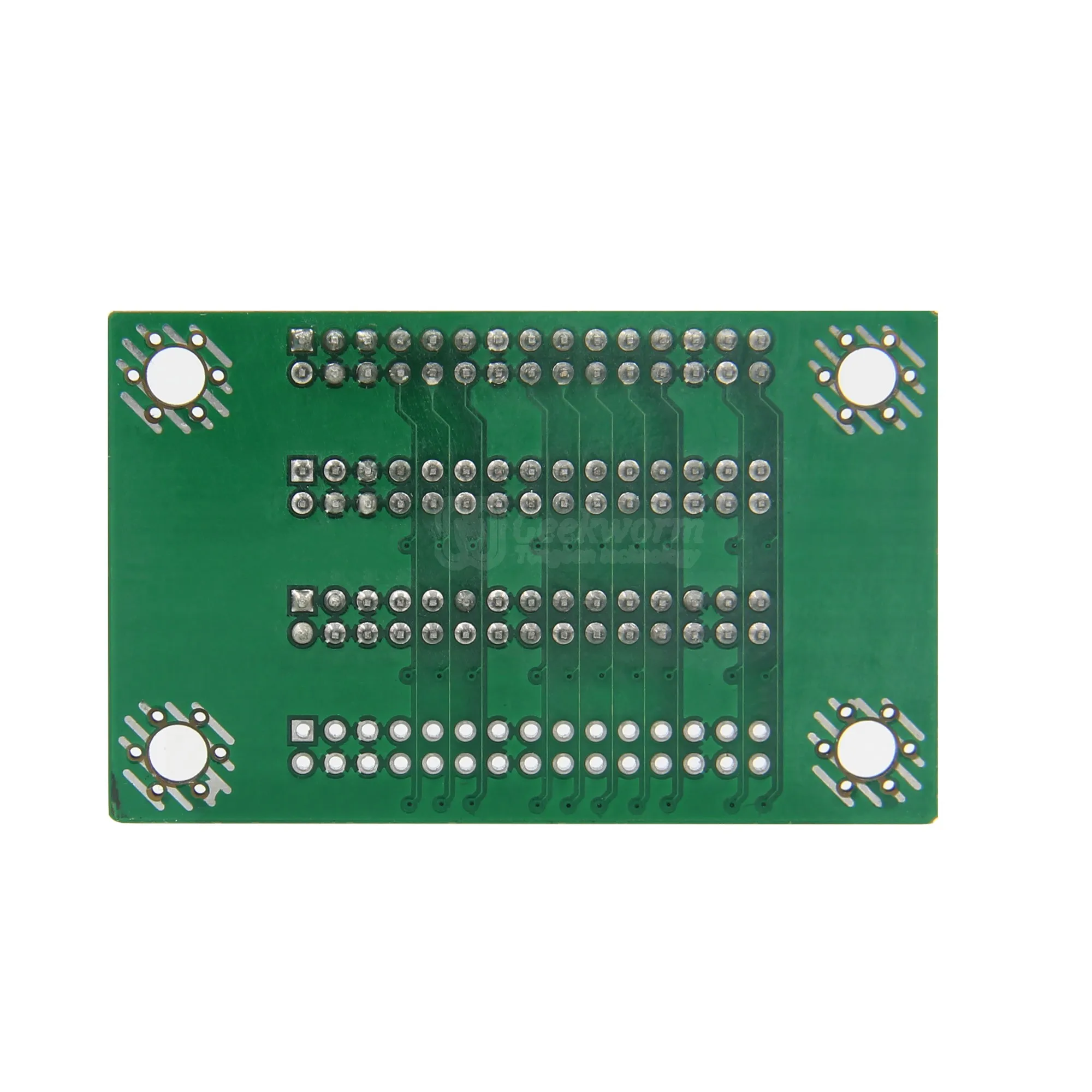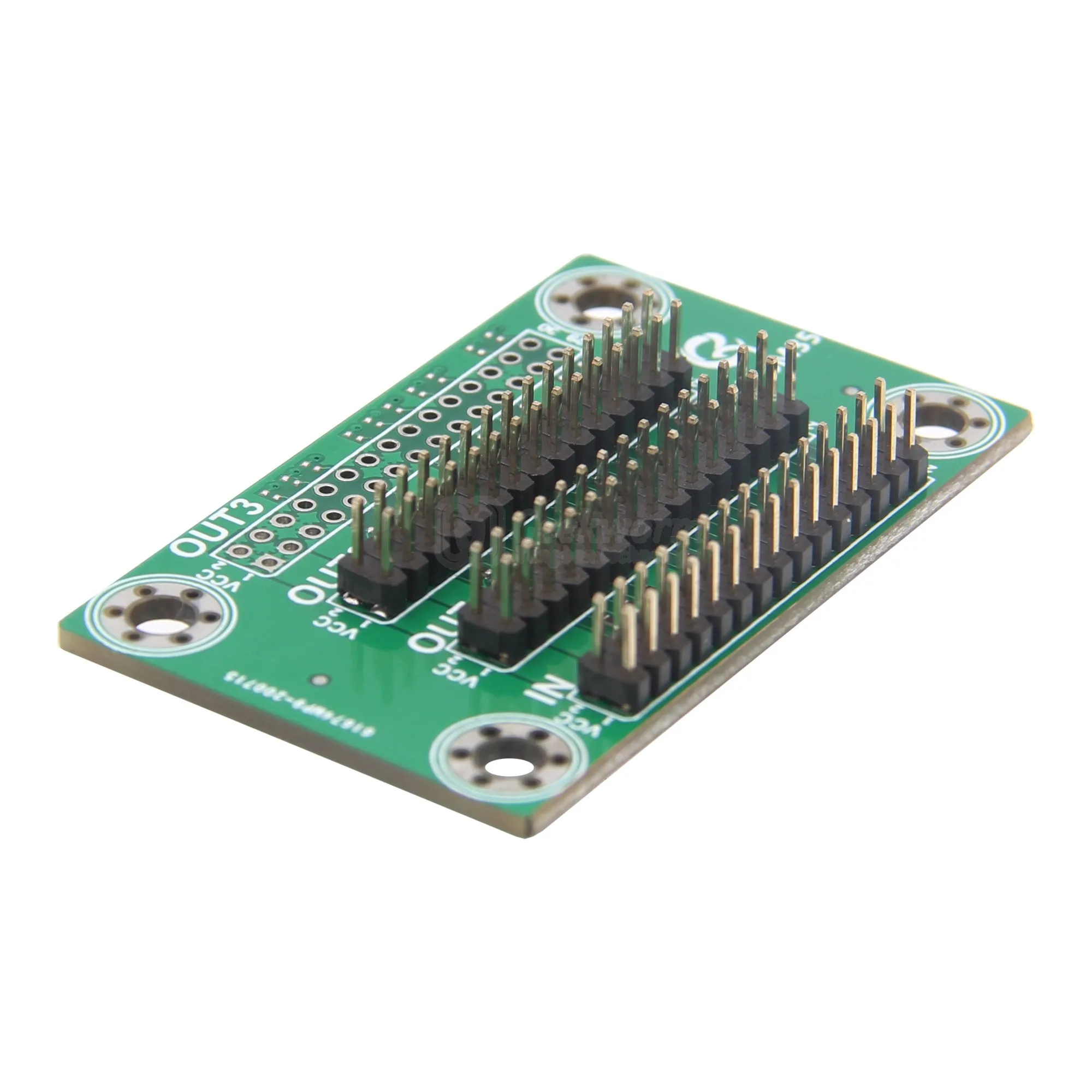 Enhance your electronic setups with this compact Geekworm LVDS Signal Distributor (model QK-6M35), featuring a vibrant green PCB with a smooth matte finish. It offers 1 input and either 2 or 3 outputs, ideal for LVDS to HDMI converter applications, ensuring efficient and reliable signal distribution. The board is equipped with three black, multi-pin male header connectors labeled “OUT1,” “OUT2,” and “OUT3,” along with power connectors “VCC” and “GND.” Its sleek design includes four reinforced mounting holes with silver rings for secure installation. Crafted for precise functionality, this extension board seamlessly integrates into larger systems, delivering outstanding performance with clear labeling and a professional aesthetic.