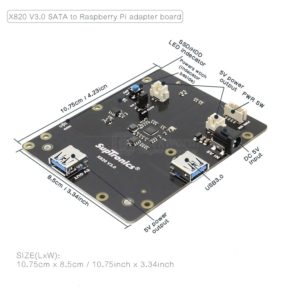 Enhance your Raspberry Pi 3B+ or 3B with this sleek SATA HDD/SSD storage expansion board, featuring a USB 3.0 to SATA 6Gb/s bridge controller for high-speed data transfer. Supporting 2.5-inch SATA drives up to 10.4mm thick, it operates with a 5V DC power supply at +/-5%, using a 5.5×2.5mm DC jack. The board measures 107.5mm x 85mm and includes a push-button power control, USB 3.0 Type A port, onboard XH2.54 connector, and a PH2.0 4-pin power switch connector for versatile connectivity. Its design facilitates USB booting, external device powering, and quick data transfer, making it an ideal upgrade for storage and data management projects.