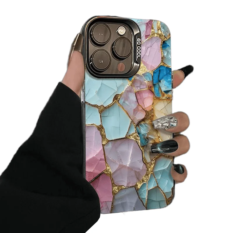 - Its glossy finish elevates the vivid pastel gemstone mosaic pattern, complemented by delicate gold lines that add a luxurious touch to your phone.