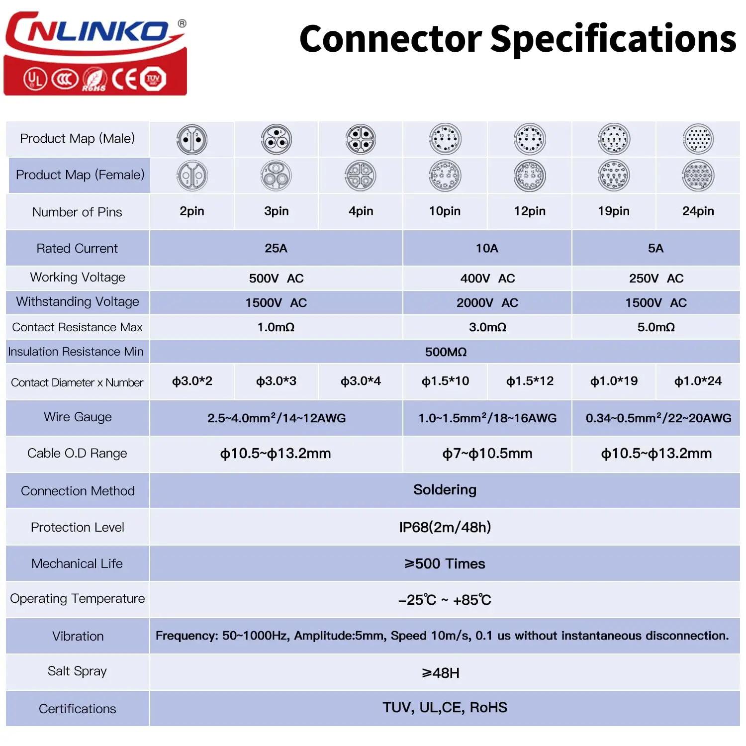 - The brass contact pins are gold-plated, supporting wire sizes from 1.0mm² to 1.5mm² (18-16 AWG) for 10/12-pin models, and 0.34mm² to 0.5mm² (22-20 AWG) for 19/24-pin models.