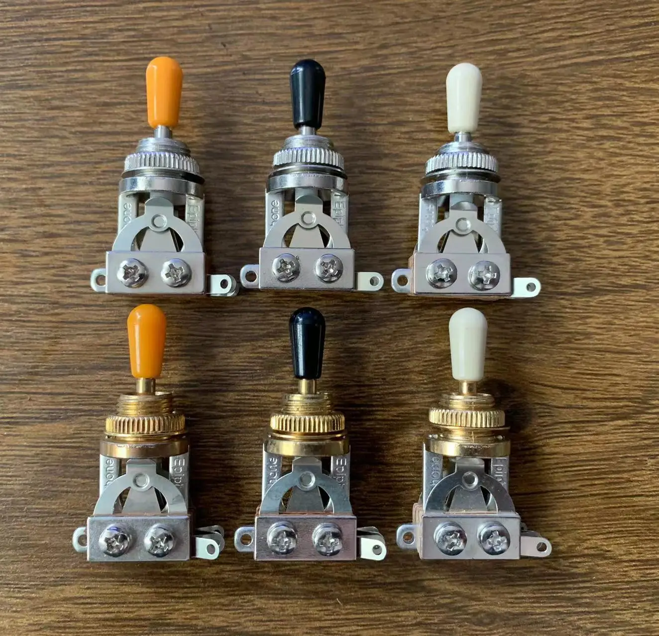 Elevate your electric guitar’s aesthetic and functionality with this professional genuine Epi 3-way toggle switch, sourced from Korea. Featuring a durable metal body and a sleek rectangular mounting plate with two small screw holes, it offers reliable performance for guitar wiring. The round, drum-shaped toggle handles come in vibrant colors—black, amber, transparent lunar, green-amber, green-black, and green-lunar—some with smooth, shiny surfaces, and others with textured gold-tone knurled rings for enhanced grip. Designed as a pickup selector, it combines rugged durability with stylish versatility, making it an essential upgrade for customizing your guitar’s sound and appearance.