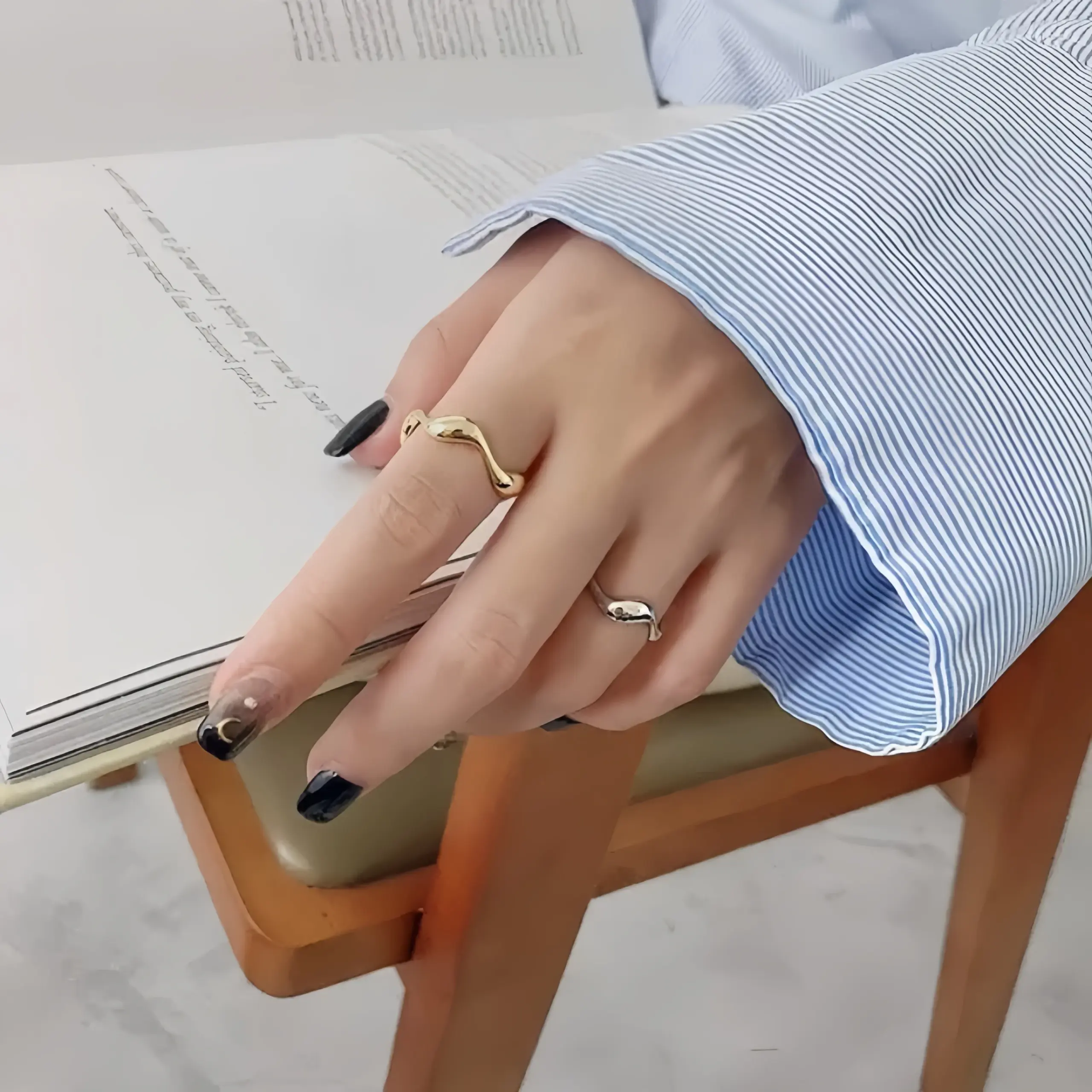 - The shape pattern combines organic, wavy lines with a clean, polished surface, aligning with contemporary fashion trends while maintaining a timeless elegance.