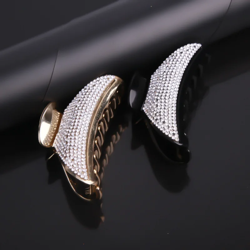 Transform your hairstyle with this stunning women's hair accessory, featuring a unique geometric moon shape. Crafted from durable acrylic, it offers a vintage-inspired design that combines elegance with practicality. The clip is enhanced with shimmering rhinestones, creating a glamorous sparkle that catches the light beautifully. Available in versatile black and luxurious gold-tone finishes, these clips are perfect for adding a refined touch to everyday or special occasions. Its curved silhouette resembles a crescent moon, providing a sophisticated and balanced aesthetic. With a secure grip, the clip easily holds hair in place, making it both stylish and functional. Whether for a casual day or an elegant evening, it elevates your look effortlessly.