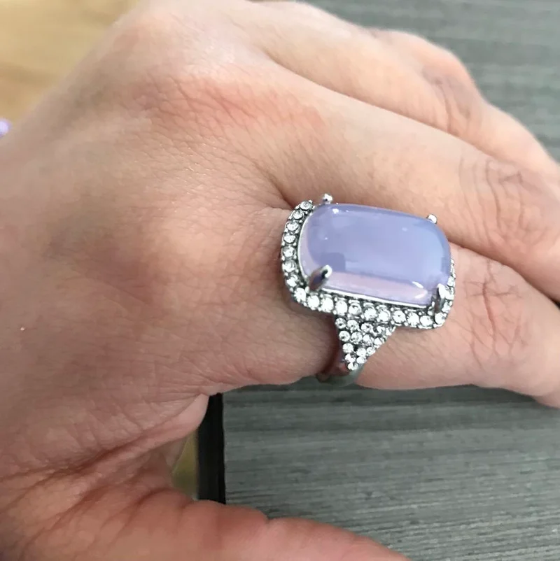 Imagine adorning your finger with this exquisite statement piece, crafted to elevate your style effortlessly. Designed with a bold, geometric aesthetic, this ring features a large, rectangular semi-translucent gemstone with a soft lavender or light gray hue that reflects light beautifully. The gemstone is surrounded by a dazzling cluster of tiny cubic zirconia crystals, creating a luxurious border that catches every glance. The wide, shiny band in silver or gold tones adds to its opulent appeal, making it perfect for special occasions or to add a touch of glamour to daily outfits. Feel confident knowing this versatile piece combines elegance with trendsetting design, making it an essential addition to your jewelry collection.