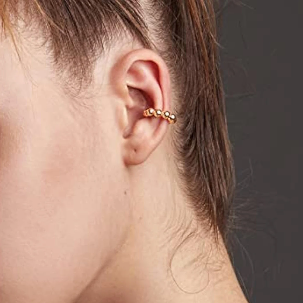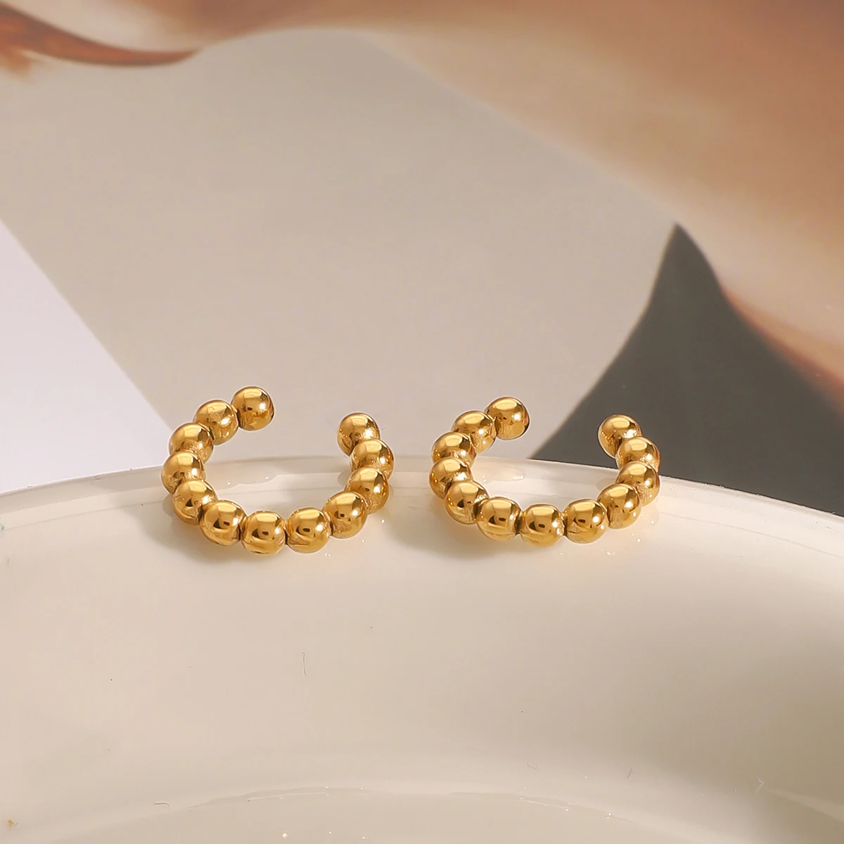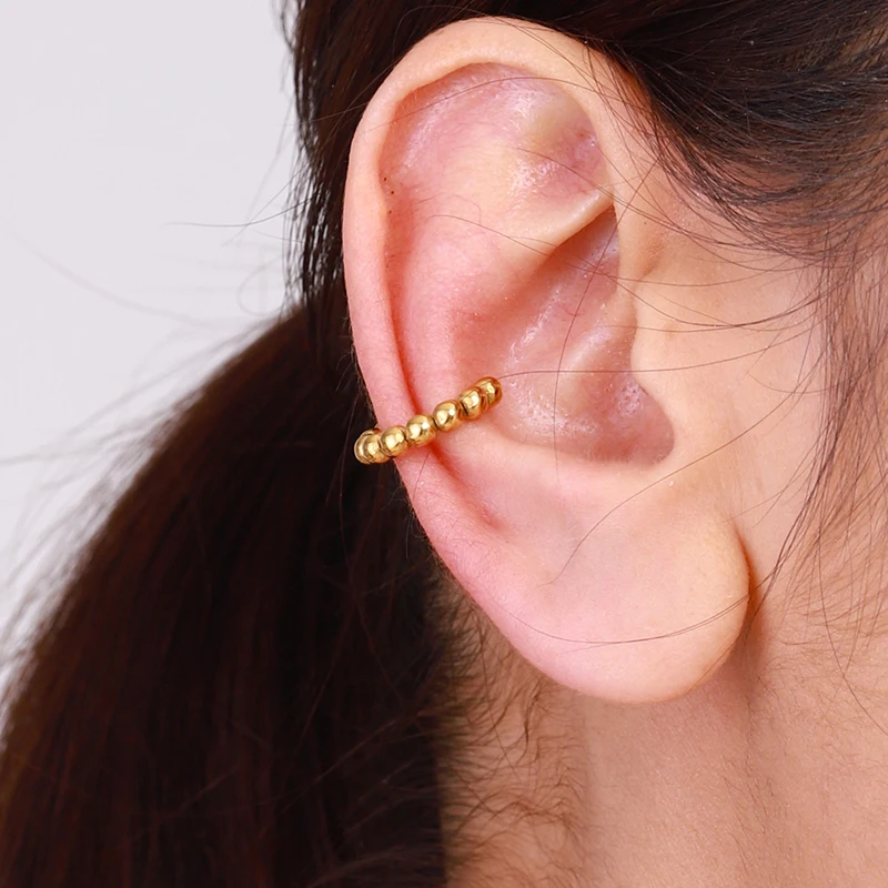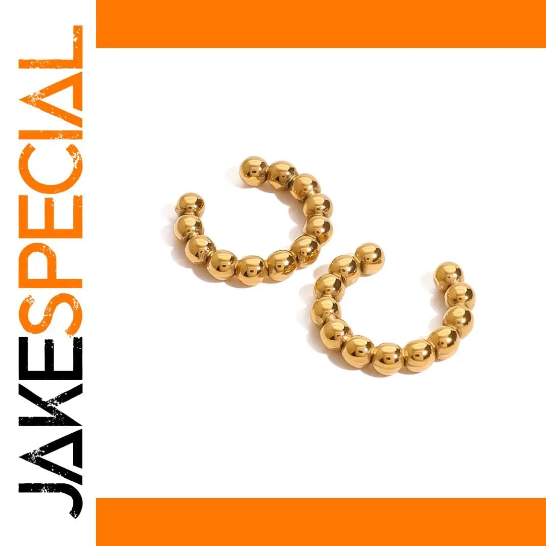 Elevate your style with this pair of stainless steel clip-on earrings featuring a modern geometric C-shape with a semi-circular silhouette. Crafted from high-quality stainless steel with a shiny gold finish, these earrings resist tarnishing and corrosion, ensuring long-lasting shine. The design is adorned with uniformly polished spherical beads that reflect light beautifully, adding a touch of elegance to any outfit. Their secure clip-on fastening makes them suitable for all, offering comfortable, everyday wear or perfect for special occasions. Unisex and sleek, these earrings embody contemporary sophistication and versatile style, making them a must-have accessory to enhance your jewelry collection.