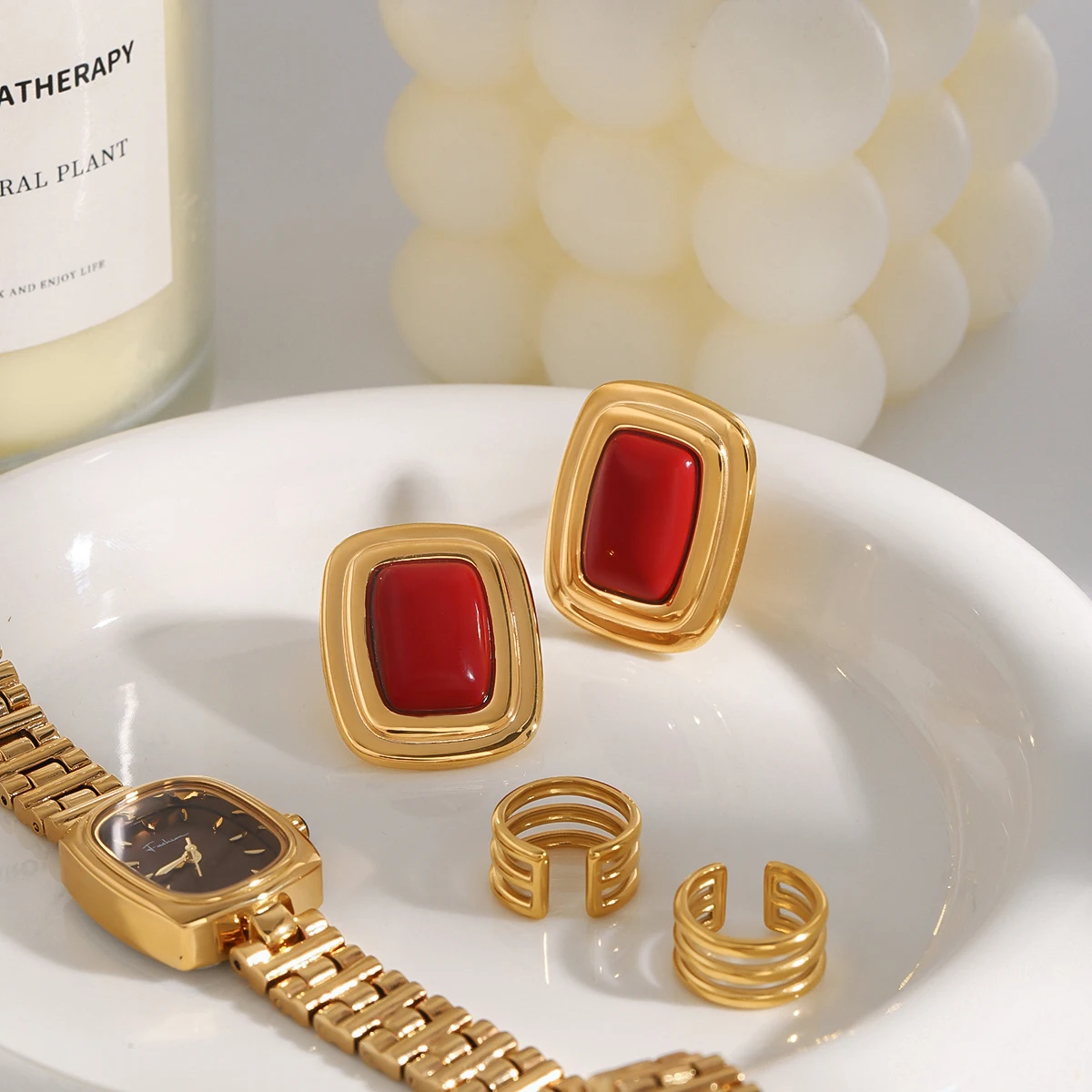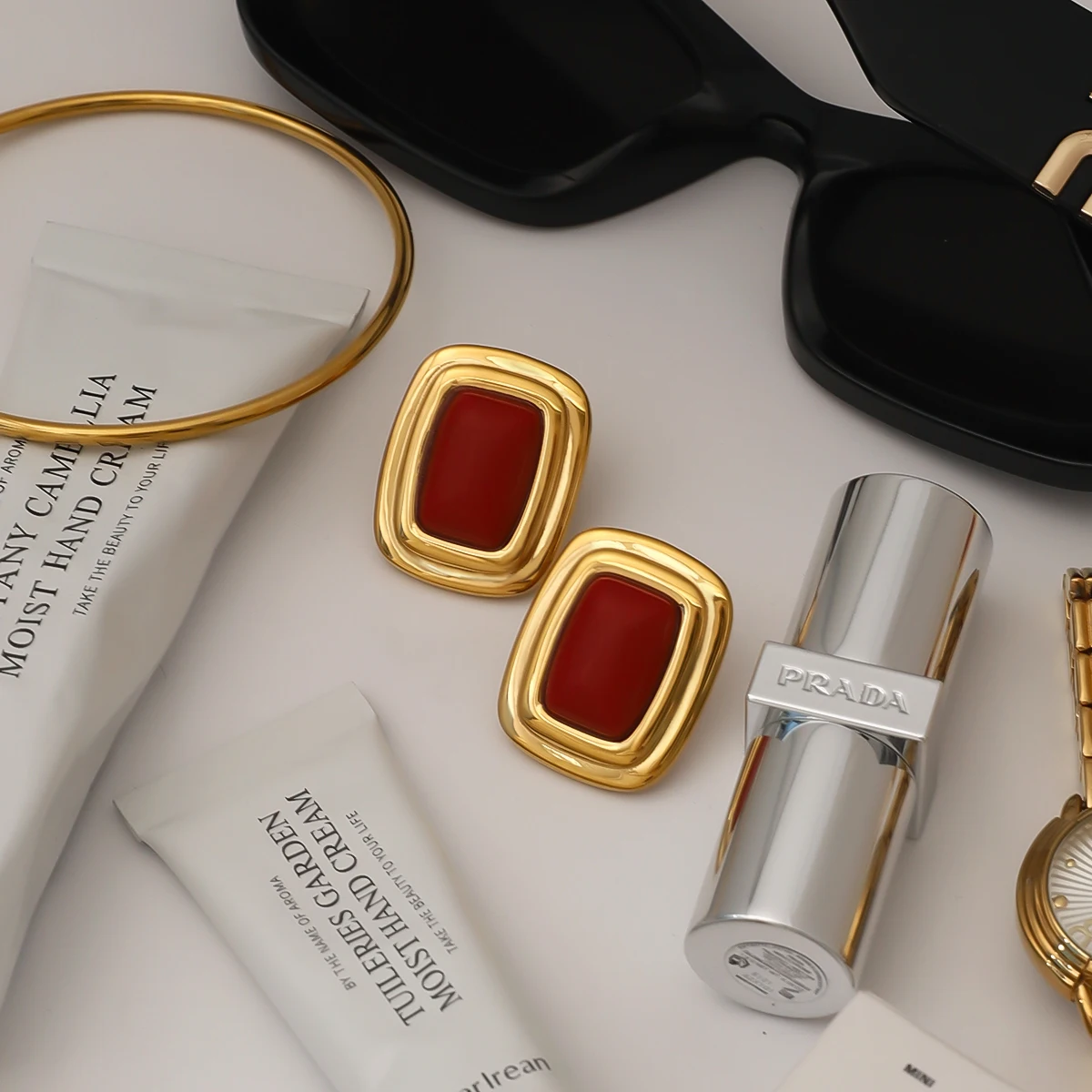 Experience a modern twist with these geometric earrings that seamlessly blend bold shapes and vibrant color. Crafted from durable stainless steel with a PVD gold finish, they boast a long-lasting, scratch-resistant surface that remains gleaming over time. Featuring a striking combination of square and round elements, these earrings highlight contemporary design principles, making them perfect for elevating any outfit. The vivid red agate centerpiece adds a pop of color and elegance, creating a statement piece that embodies trendy sophistication. Lightweight and comfortable with a secure push-back fastening, these earrings are waterproof and free from nickel, lead, and cadmium. Designed for women seeking an eye-catching and durable accessory, they are suitable for everyday wear or special occasions, adding a touch of luxury to your jewelry collection.