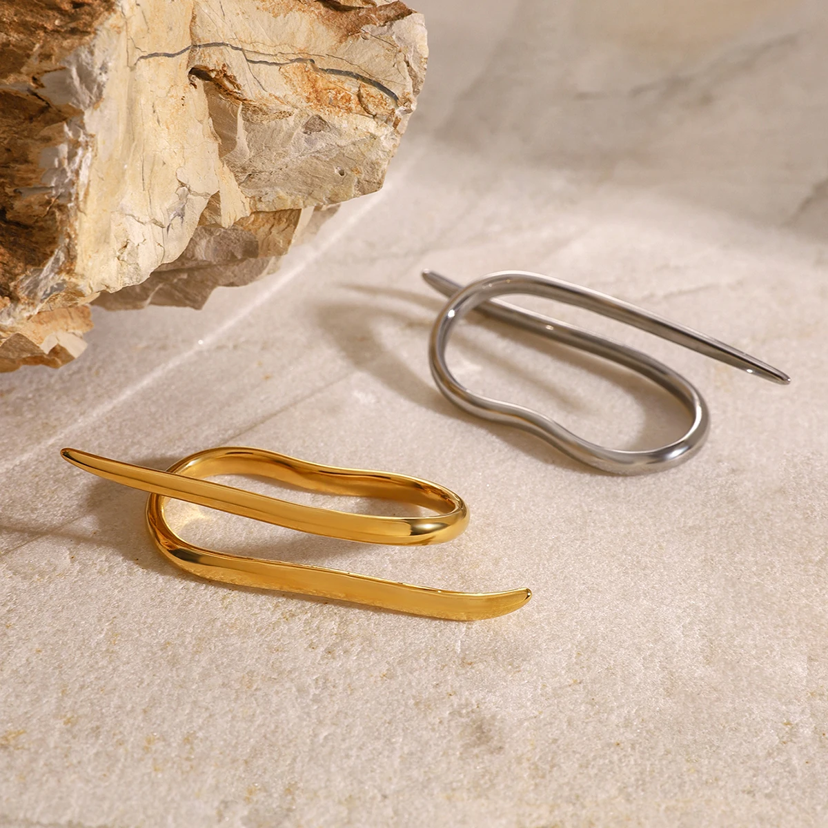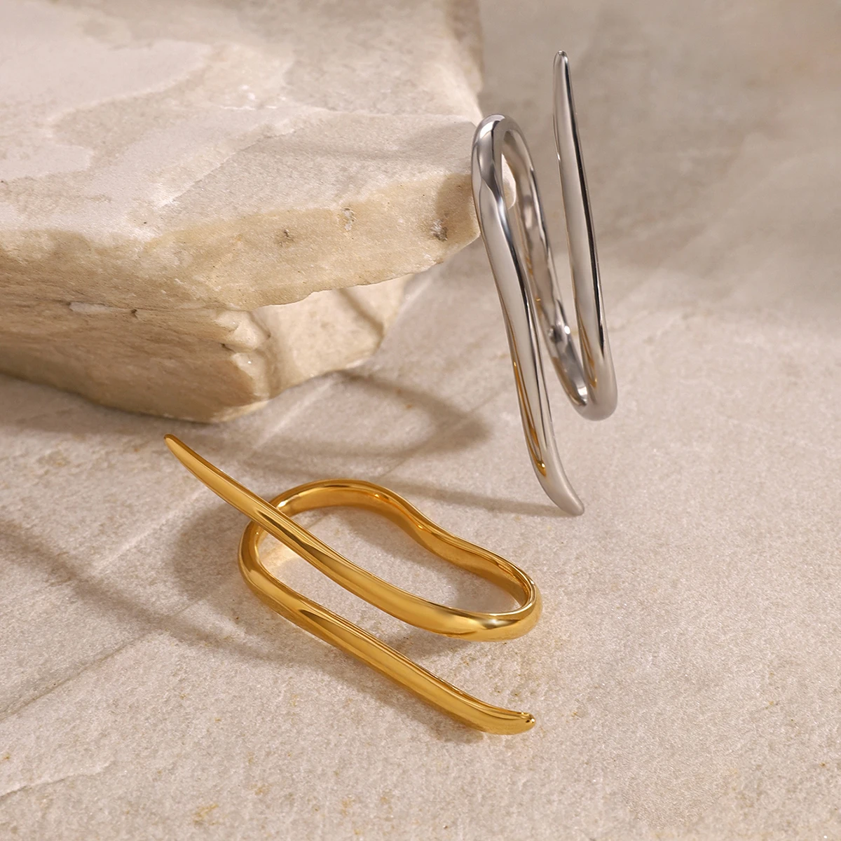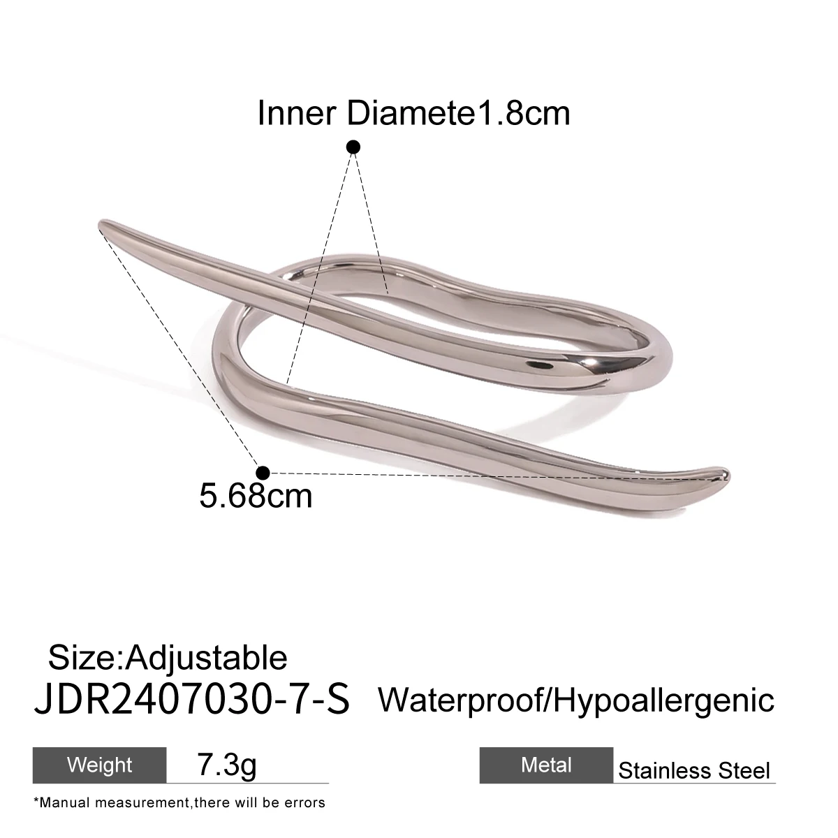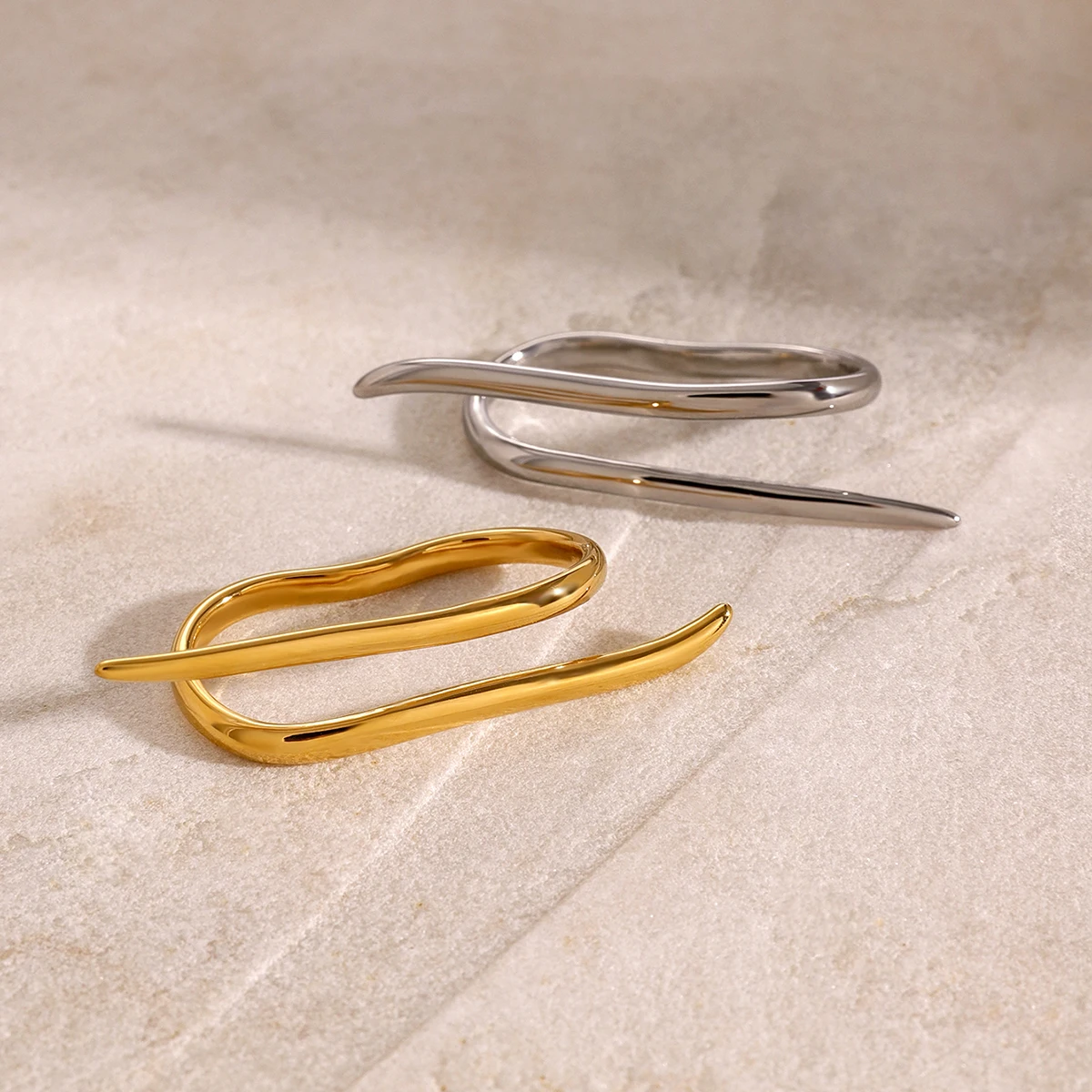 Experience effortless style with this stunning geometric stainless steel ring, designed for contemporary tastes. Its sleek, minimalist aesthetic features elongated, flowing lines that resemble an abstract S-shape, adding a touch of artistic sophistication to your look. Made from high-quality stainless steel, this ring is highly durable, waterproof, and resistant to tarnish, ensuring lasting shine and beauty through daily wear and special events. Finished with either a PVD gold coating or a lustrous silver-tone surface, it boasts a highly reflective metallic sheen that enhances its modern appeal. The open-ended design allows easy adjustment for a perfect fit on size 7 fingers, combining comfort and elegance seamlessly. Elevate your jewelry collection with this versatile piece, suitable for any occasion, from casual outings to elegant gatherings.