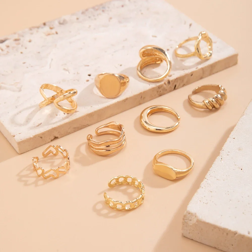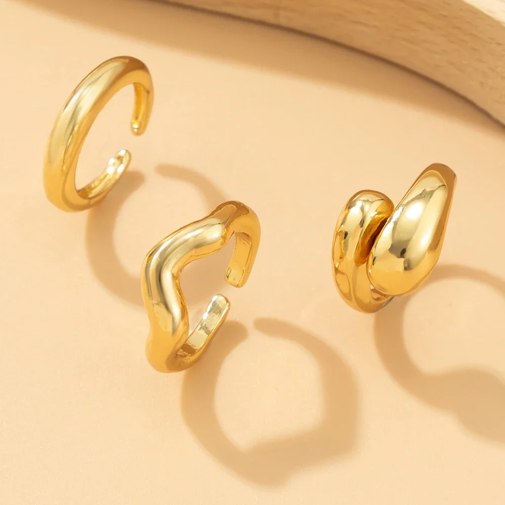 - This set includes three zinc alloy rings with a shiny, reflective gold finish, each featuring distinct geometric, wave, and irregular shapes, perfect for a modern and edgy aesthetic.
