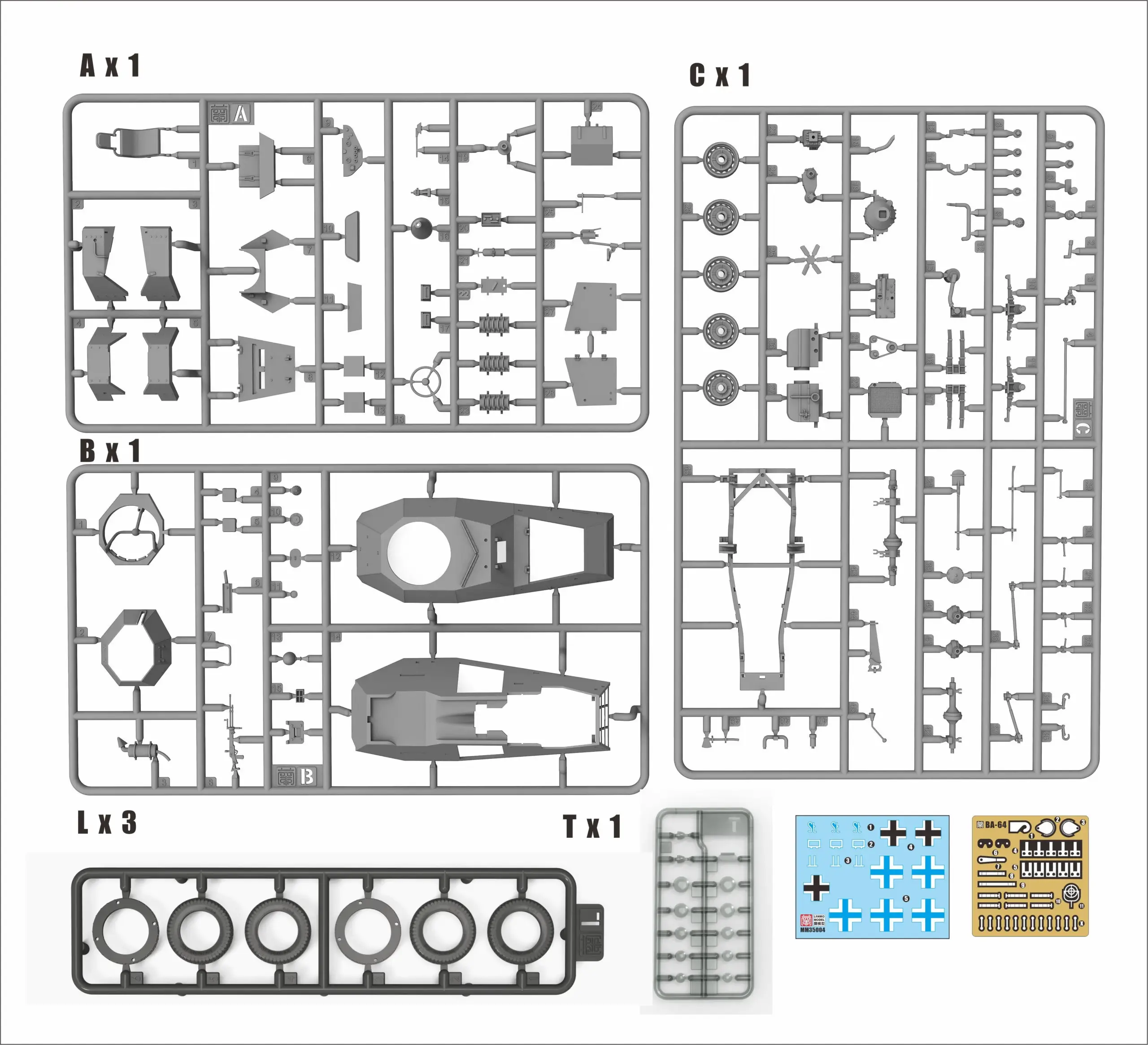 Experience the detailed realism of the 1:35 scale German Army BA-64B (r) light armored car model, crafted from high-quality plastic with fully internal detailing. This first batch features innovative 3D printed components, enhancing authenticity and precision. The weathered beige or light tan exterior, accented with prominent black and white German military markings, brings the rugged, vintage military vehicle to life. Its angular, boxy design includes detailed external features like hatches, side mirrors, a front-mounted headlight, and a rust-colored machine gun barrel, set against a subdued rural landscape backdrop. Designed for hobbyists aged 14 and above, this model offers an immersive building experience, perfect for collectors seeking realistic military miniatures.