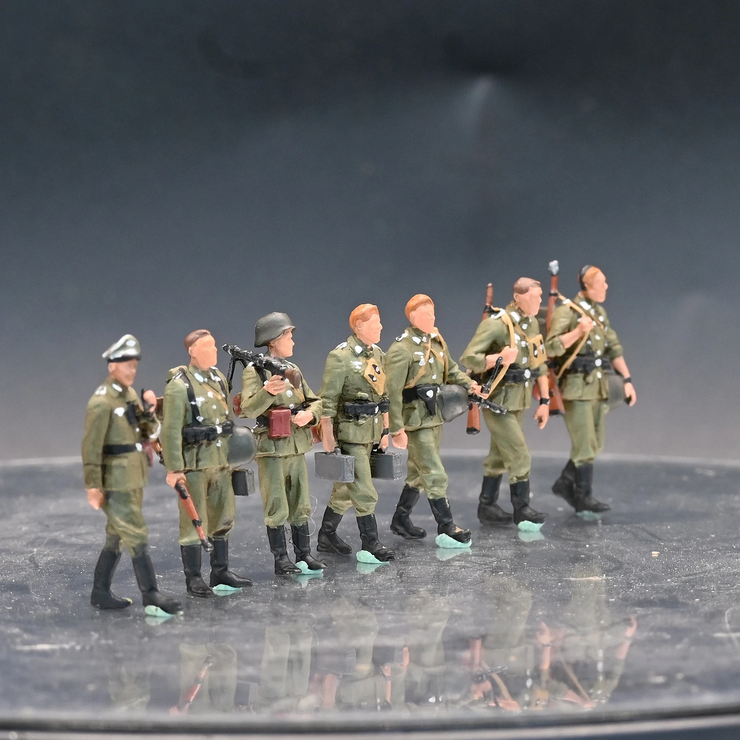 - Each figure has intricate accessories, including belts, pouches, helmets, caps, and rifles slung or held in poses of movement.