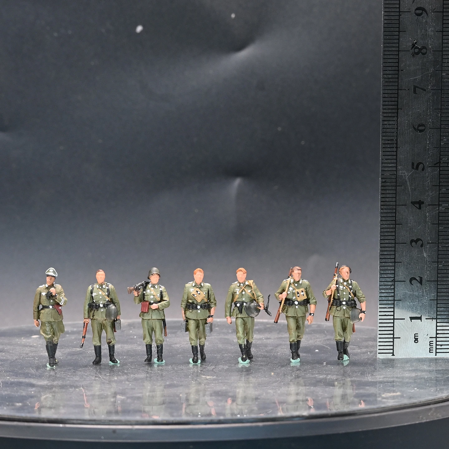 - Detailed 1:72 scale resin figures depict a realistic marching scene of seven soldiers in formation.