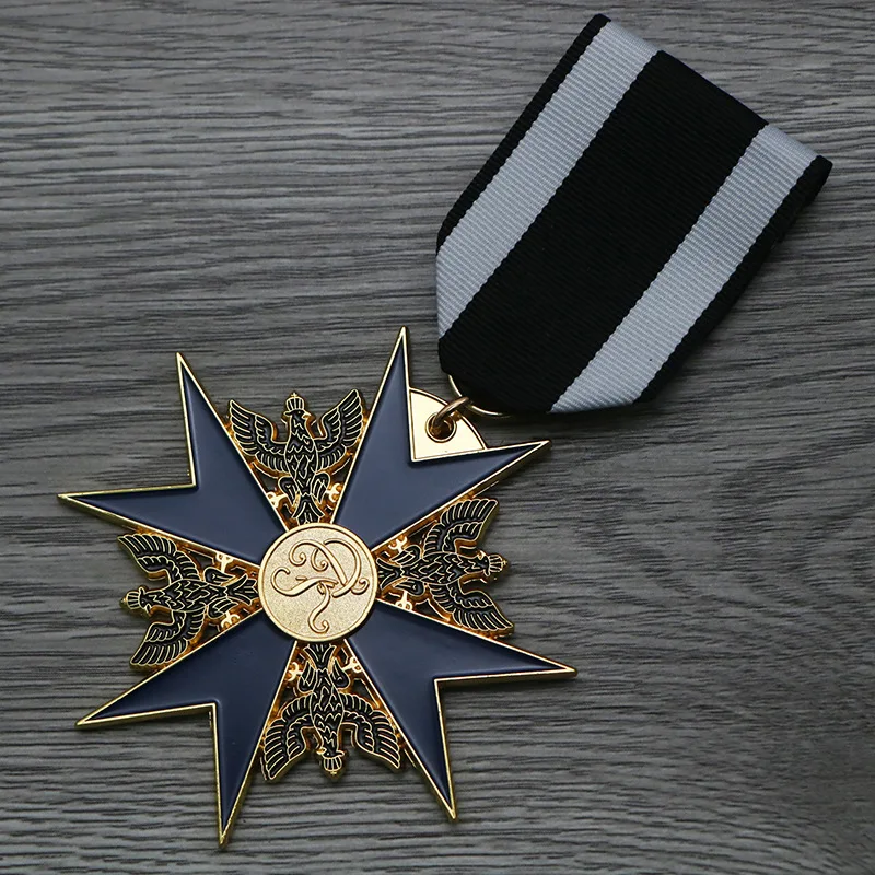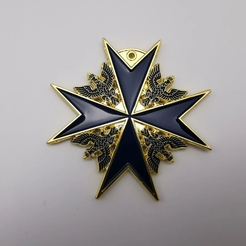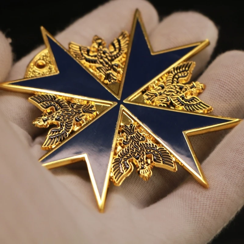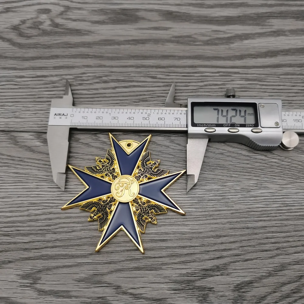 This German Black Eagle Medal features a stunning 74 mm star-shaped design crafted from durable zinc alloy, with a smooth, polished finish and gold-colored edges that highlight its ornate craftsmanship. It showcases detailed black-finished stylized eagles arranged symmetrically at the center, emanating an authoritative and ceremonial aesthetic. Designed without a ribbon, it includes a small attachment opening for easy fastening to clothing or accessories, making it ideal for collectors and enthusiasts who appreciate intricate design and historical symbolism. Perfect for display or wear, this exceptional medal captures an elegant blend of regal colors and meticulous detailing, elevating any collection with its distinguished presence.