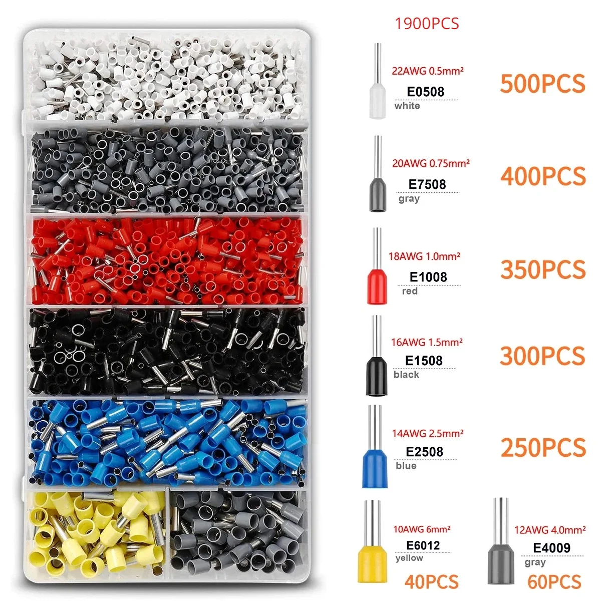 - Includes a transparent plastic organizer filled with 1900 or 800 insulated ferrules, organized by color for easy identification and selection.