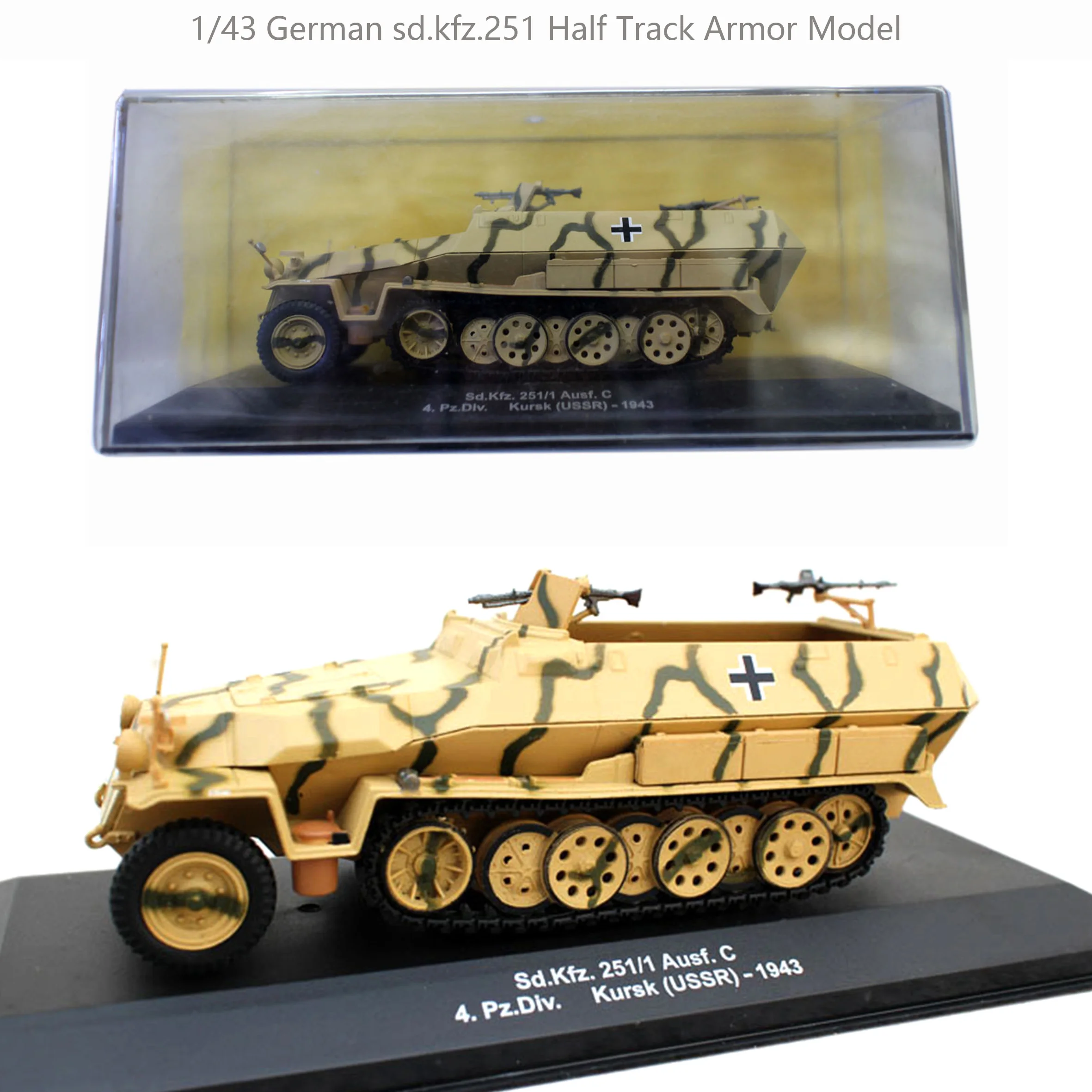 The 1/43 scale model of the German Sd.Kfz. 251/1 Ausf. C half track vehicle is an exquisite representation of the vehicle used during the Kursk offensive in 1943. With a polished diecast alloy body and detailed plastic parts, it measures approximately 13.5 cm in length. The model showcases a striking camouflage pattern in shades of beige, light brown, and dark green, along with six intricately detailed wheels featuring textured surfaces. Its open-top design reveals interior details, while it rests on a sleek black display base, making it a perfect addition to your collection.