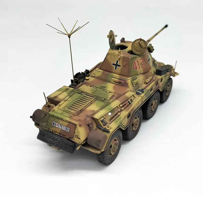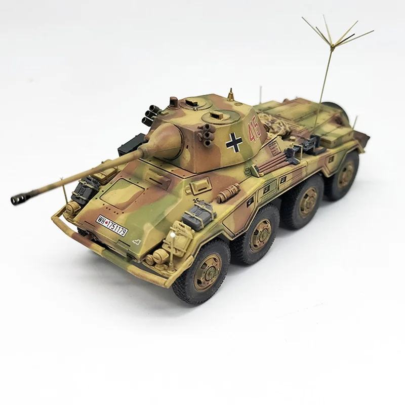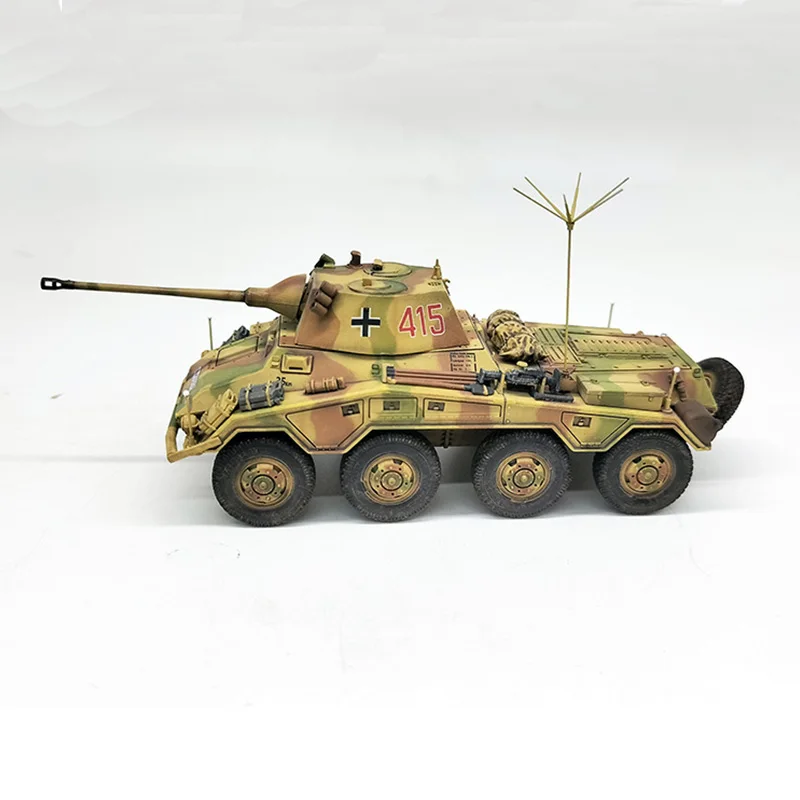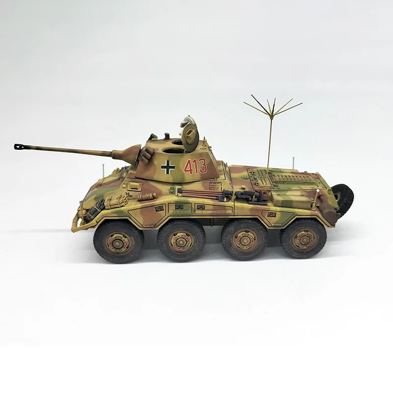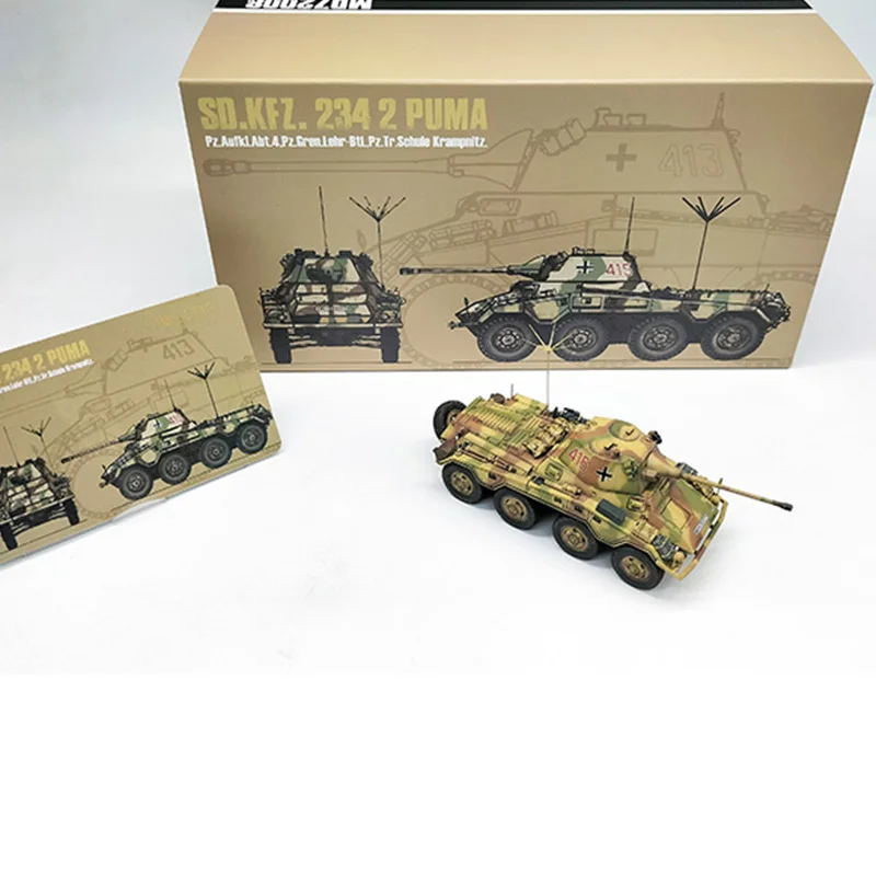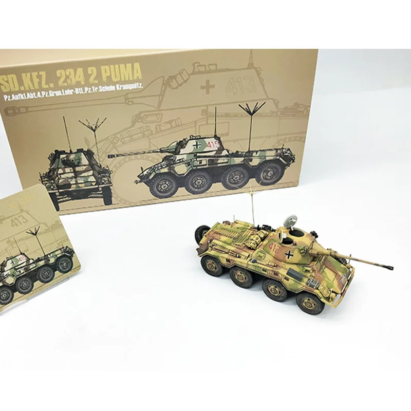 Immerse yourself in the world of military history with this meticulously crafted 1/72 scale model of the German SDKFZ234/2 Puma. Perfect for display, this model captures the rugged aesthetic of the original armored vehicle through intricate surface details like hatches, panels, and textures. The camouflage pattern in earth tones of tan, green, and brown enhances its realistic appeal, while the black rubber tires with visible treads add tactile authenticity. The highlight is the shiny alloy barrel mounted on top, giving a striking metallic contrast that amplifies its detailed craftsmanship. Whether you're a collector or enthusiast, owning this model makes a compelling display piece that showcases your appreciation for military engineering and design.