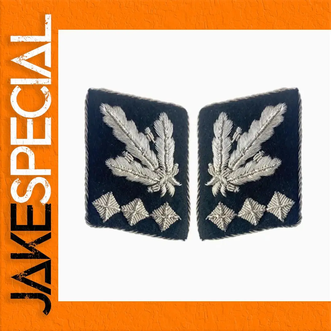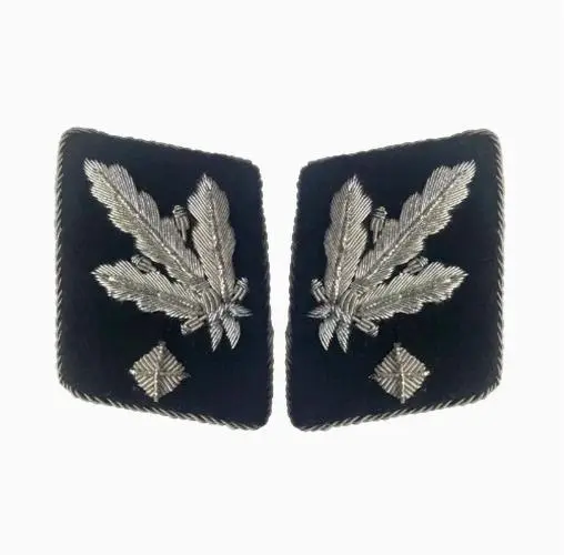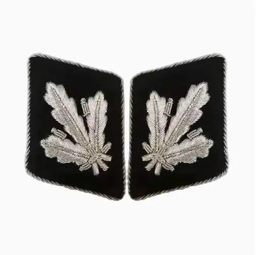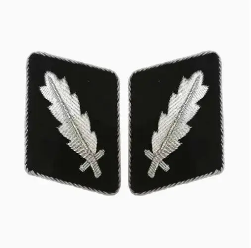 The German Shoulder Badge Collar Badge is a unique accessory perfect for collectors and enthusiasts. With its deep black background, the badge highlights an intricate silver embroidery featuring two stylized feathers, creating a visually striking contrast. Below the feather, a symmetrical pattern of diamonds in the same silver hue further enhances its elegance. The edges are adorned with a braided silver thread, providing a polished finish. Crafted from high-quality materials, this badge exhibits meticulous workmanship, making it an ideal choice for military or uniform insignia collectors. Available in six distinct colors, this accessory is versatile for various styles and settings.