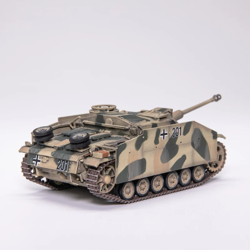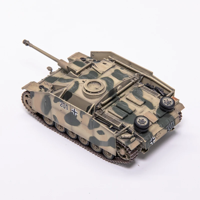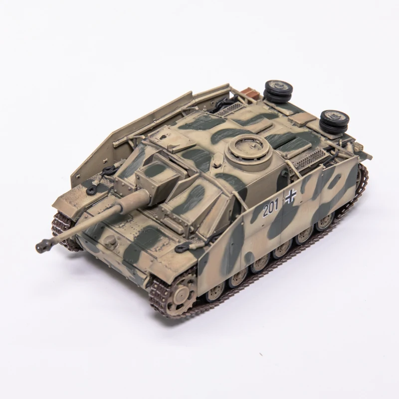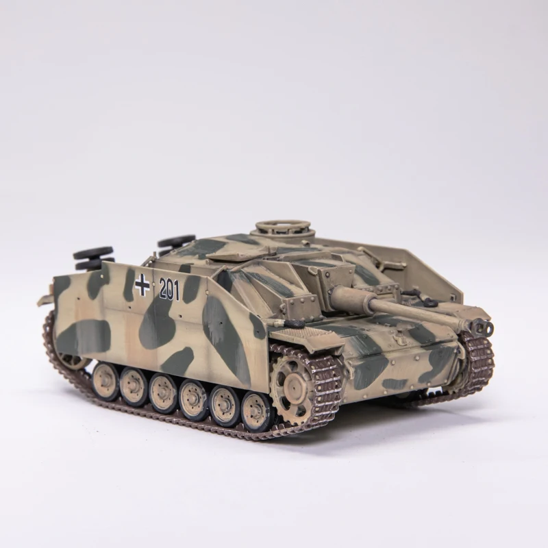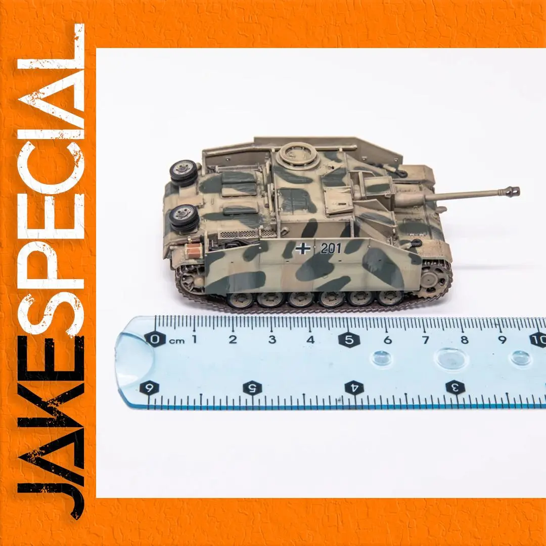 This 1:72 scale German Type 3 Assault Tank G model delivers an incredibly detailed representation of the iconic vehicle from the 242 Assault Artillery Brigade in 1943 Italy. Measuring approximately 103 mm in length, 40 mm in width, and 42 mm in height, this high-quality plastic model showcases an intricate camouflage pattern featuring shades of green and beige accented with darker splotches. Perfectly designed for adult collectors, this tank reflects historical authenticity with its rounded turret, multiple hatches, and the majestic cannon prominently displayed. The well-detailed tread wheels and insignia complete a model that will enhance your collection and serve as a cherished piece of history.