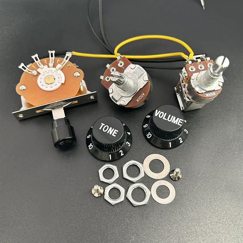 - The 2T1V version offers two tone controls and one volume control, each equipped with 500K pots, axial capacitor 473J, and matching black knobs, perfect for tonal blending on multiple pickups.