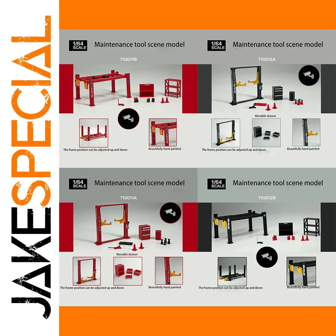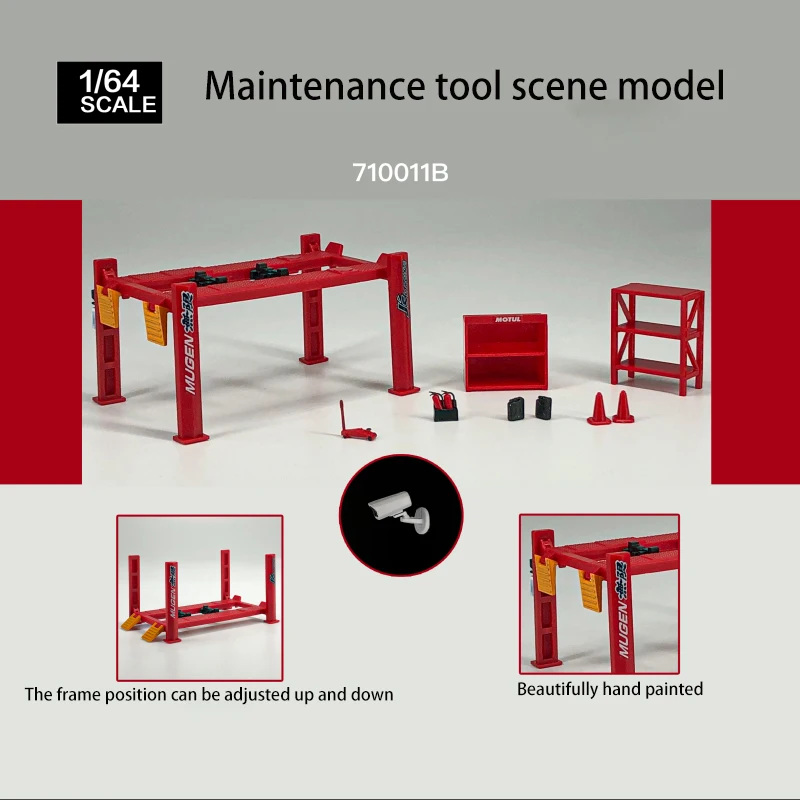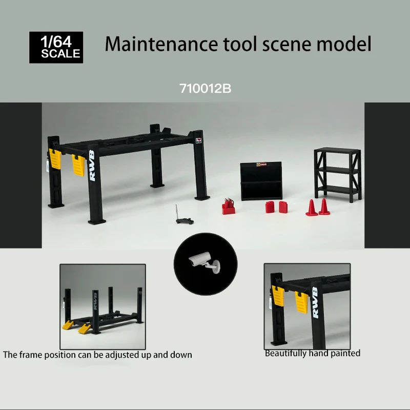 Enhance your collection with this detailed GFANS 1:64 maintenance tool scene model garage lift set, featuring an adjustable height lift crafted from environmentally friendly ABS plastic and diecast metal components. Fully hand-painted for realistic detailing, the set includes a garage lift and scene accessories such as cones, shelves, and small toolboxes, available in four striking color options: Black-A style, Red-Type A, Red-Type B, and Black-B style. Designed for adult collectors, this non-electric, battery-free diorama offers a scale of 1:64, with realistic adjustable features and vibrant accents to bring your miniature scene to life. Perfect for display or dynamic scene creation.