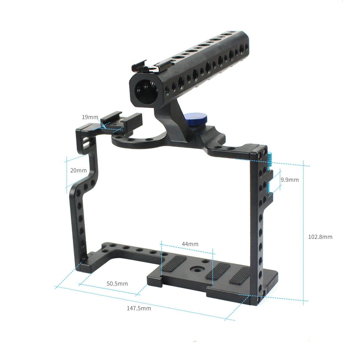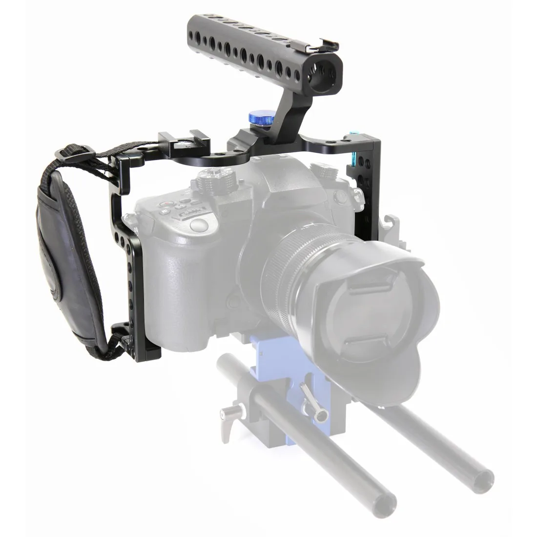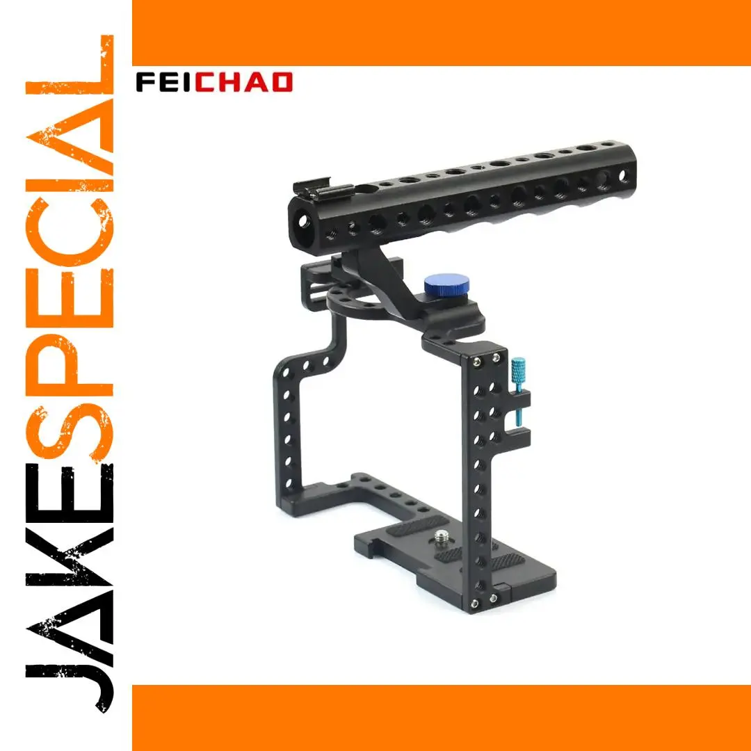 Enhance your filmmaking setup with this high-strength aluminum alloy DSLR camera cage optimized for the Panasonic Lumix GH5. Featuring a durable, lightweight black anodized finish with a textured glass bead blasting surface, it offers a compact, precisely machined design with smoothly drilled mounting holes. Equipped with two hot/cold shoe mounts for LED lights and microphones, an HDMI cable saver clip, and a versatile rod system, it provides free-angle adjustment and multiple accessory attachment points. The ergonomic top handle grip and hand-hold strap ensure stability during handheld shots. This professional-grade cage is ideal for serious videographers seeking durability, modularity, and precision in their camera rig.