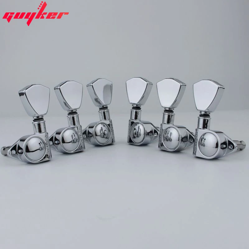 Imagine effortlessly tuning your guitar with this sleek, modern set of three guitar machine heads. Crafted from durable metal, these tuners boast a highly reflective chrome-like finish that adds a touch of sophistication to your instrument. The precise design features trapezium-shaped buttons with a geometric, angular form and slightly rounded edges, providing both style and comfort. Each tuner includes a smooth, shiny round knob for fine tension adjustments, ensuring your strings stay perfectly in tune. Their minimalist yet robust construction guarantees long-lasting performance and easy installation. Available in black, chrome, or gold, these high-quality tuners are perfect for upgrading your guitar’s look and functionality, enhancing your playing experience with their durable and premium craftsmanship.