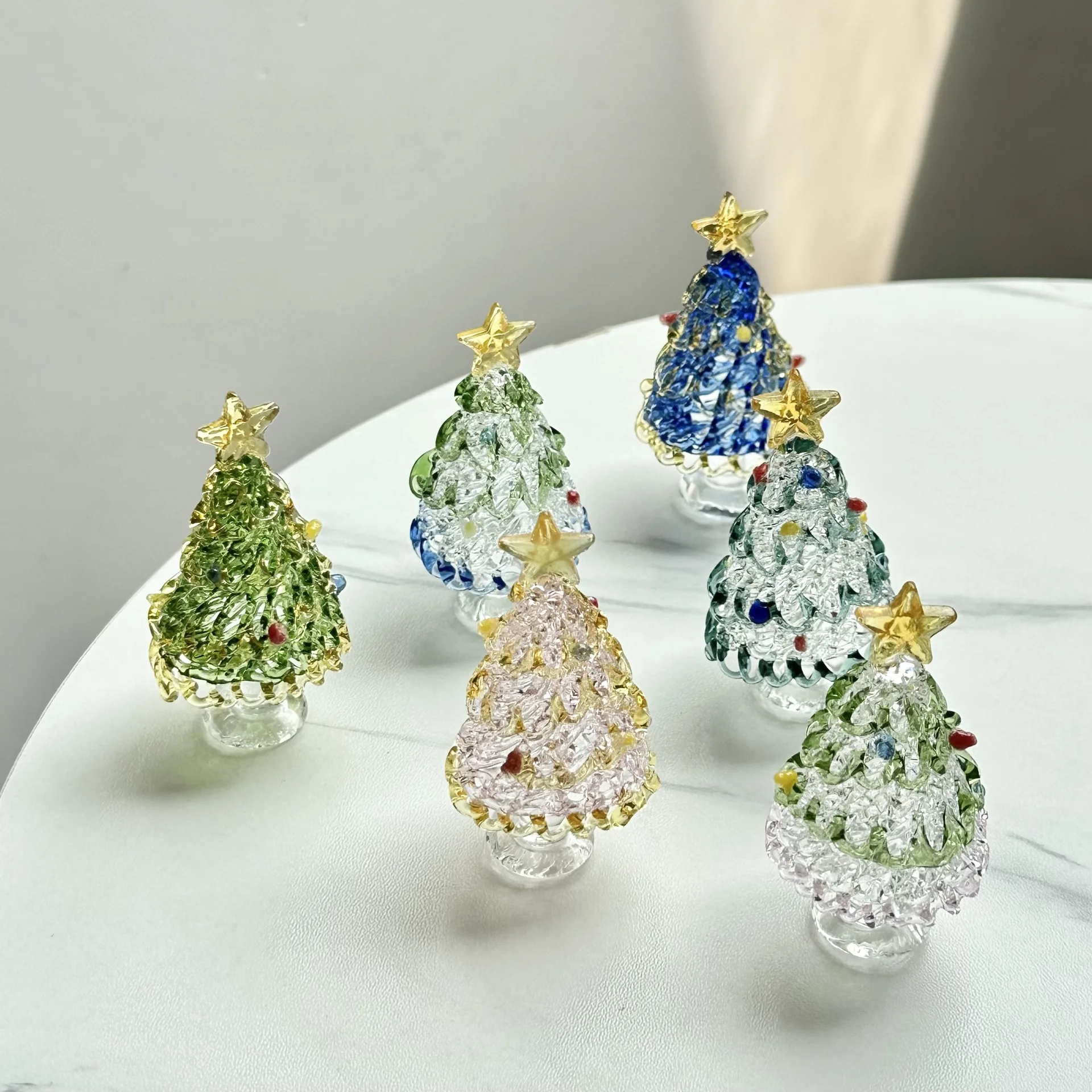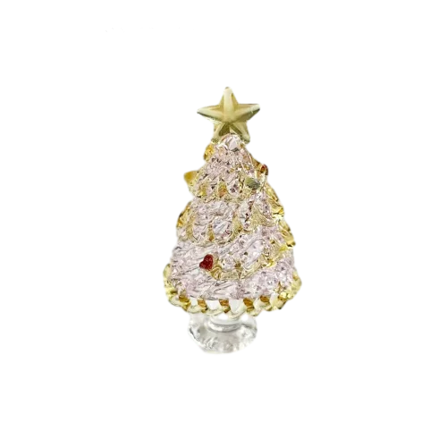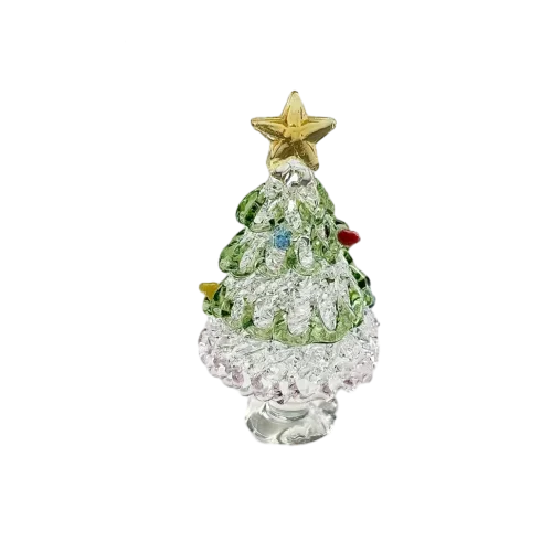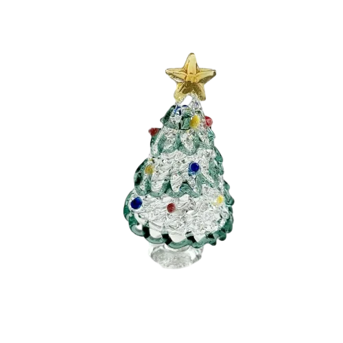 Transform your holiday decor with this exquisite collection of glass Christmas tree ornaments. Each piece stands 2.4″ tall, perfect for desktop displays or holiday table settings. Crafted with meticulous attention to detail, these cone-shaped trees feature layered, textured branches that mimic the natural look of a pine tree. The glossy, reflective finish captures light beautifully, adding sparkle and elegance to your festive environment. Available in eight vibrant styles—from clear and pastel pink to vivid blue and lush green—each ornament is accented with tiny, colorful details resembling miniature ornaments in red, yellow, blue, and green. Topped with a delicate golden star, these ornaments combine charm and craftsmanship, making them a joyful addition to your holiday collection or a thoughtful gift for loved ones.