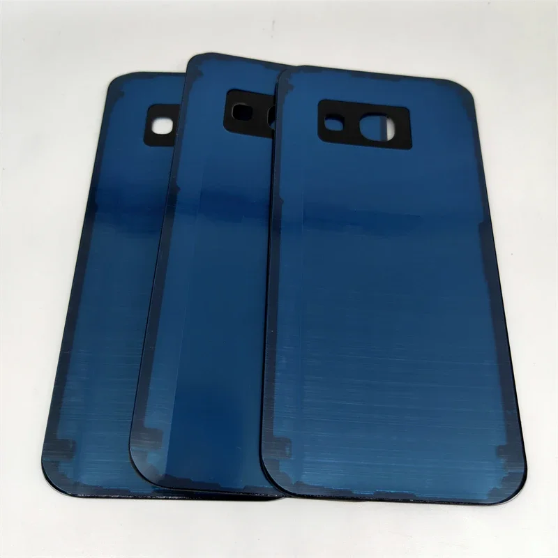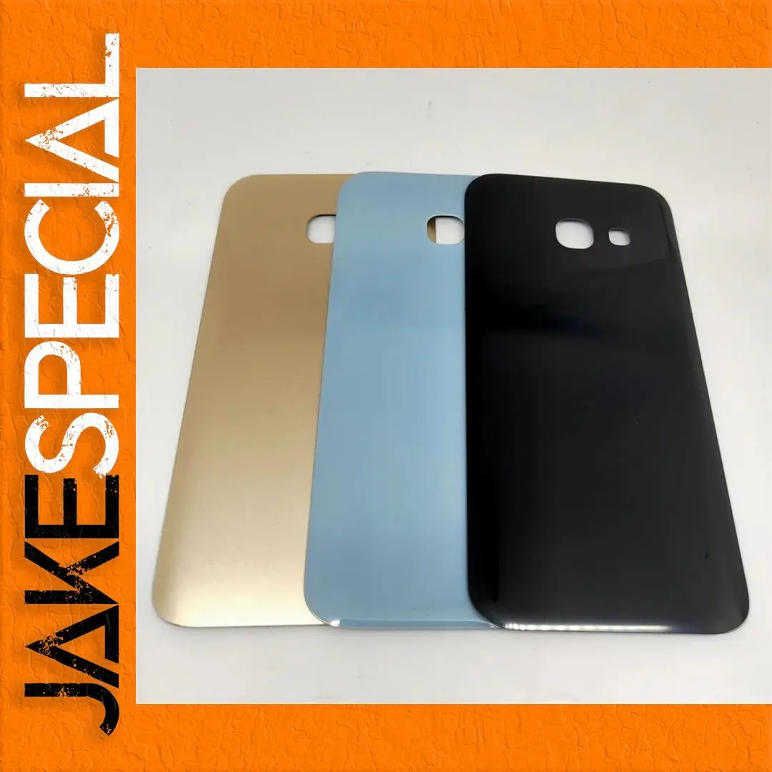 The product features an array of three elegant replacement battery back covers, designed specifically for the Samsung Galaxy A3, A5, and A7 models from 2017 (A320, A520, A720). Each cover is meticulously crafted from high-quality glass, offering a luxurious feel and appearance. With options in stunning colors such as shiny gold, serene blue, and sophisticated black, users can customize their device with style. The rounded edges ensure a snug fit, while precise cutouts for the camera and sensors allow for seamless functionality. Elevate the look of your smartphone with these stylish and durable back covers.