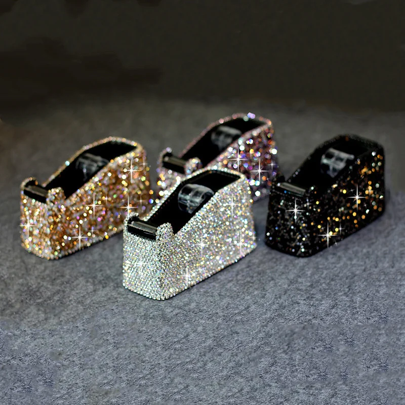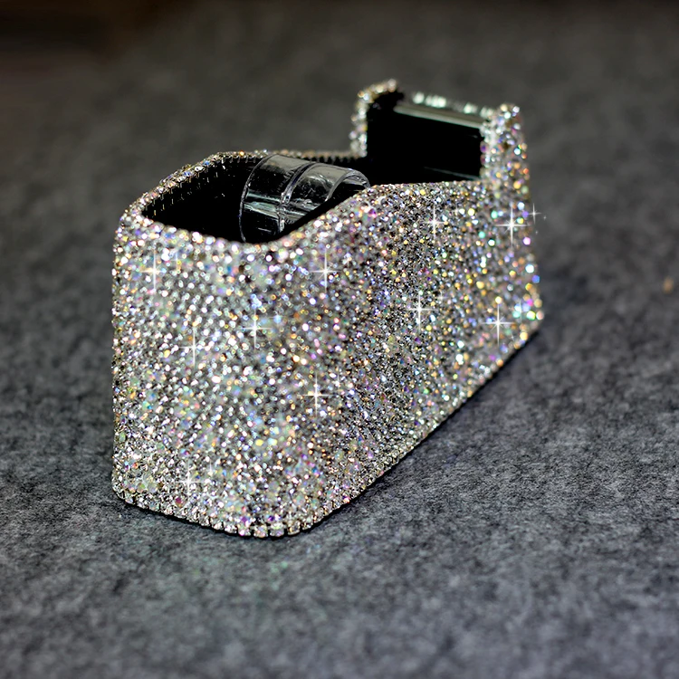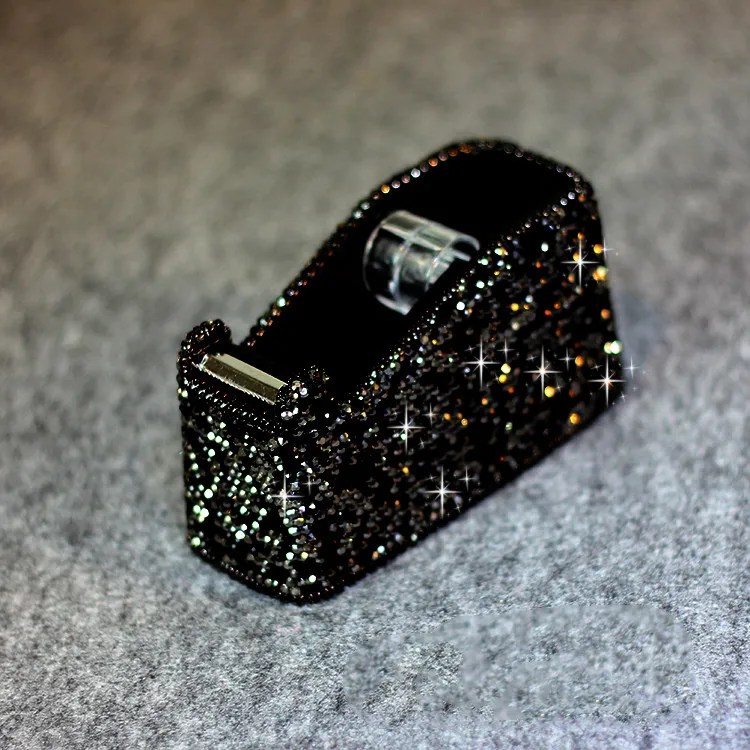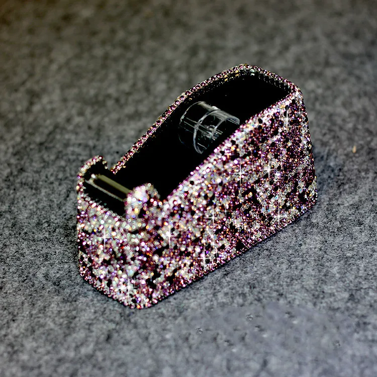 Imagine elevating your workspace with this stunning, glittery tape dispenser. Designed for both functionality and style, it features a dense rhinestone exterior that sparkles with multicolored reflections, adding a touch of luxury to any desk. Its compact, rectangular shape with rounded edges makes it a perfect decorative accessory that seamlessly blends into your office decor. The black interior lining contrasts beautifully with the shimmering exterior, highlighting its glamorous yet practical design. Equipped with a clear, serrated tape cutter, this dispenser ensures clean, effortless tape tearing. Available in four elegant colors—black, white, purple, and champagne—you'll find the perfect match for your personal or professional space. durable, stylish, and eye-catching, this tape dispenser transforms a simple office essential into a captivating accent.