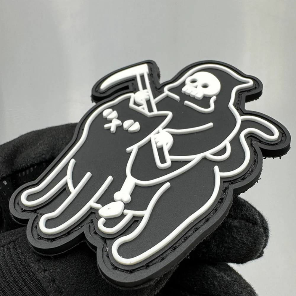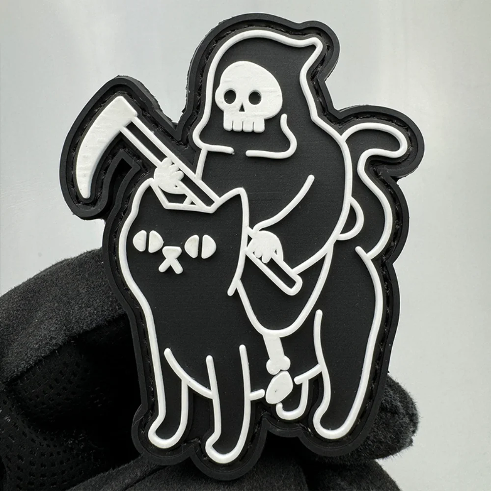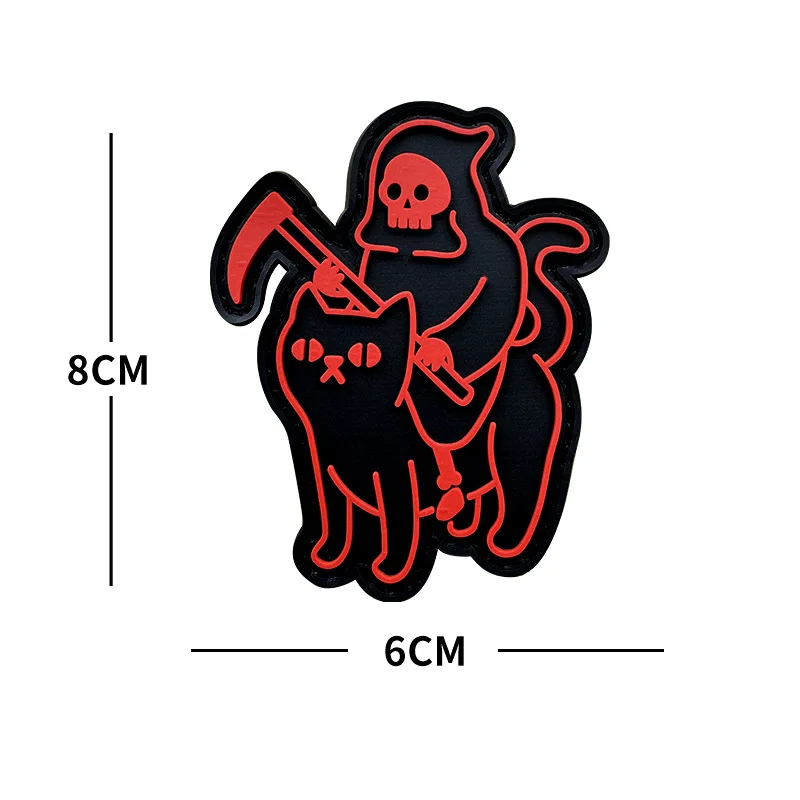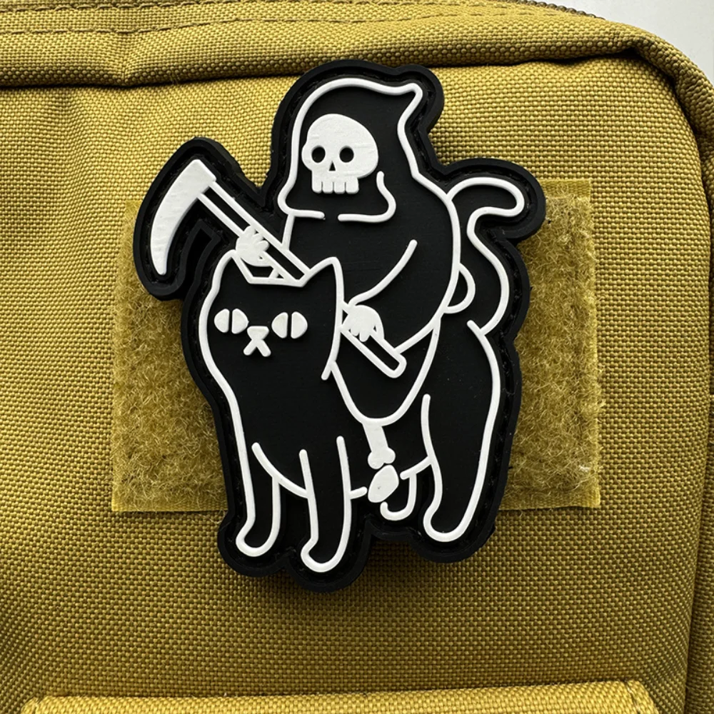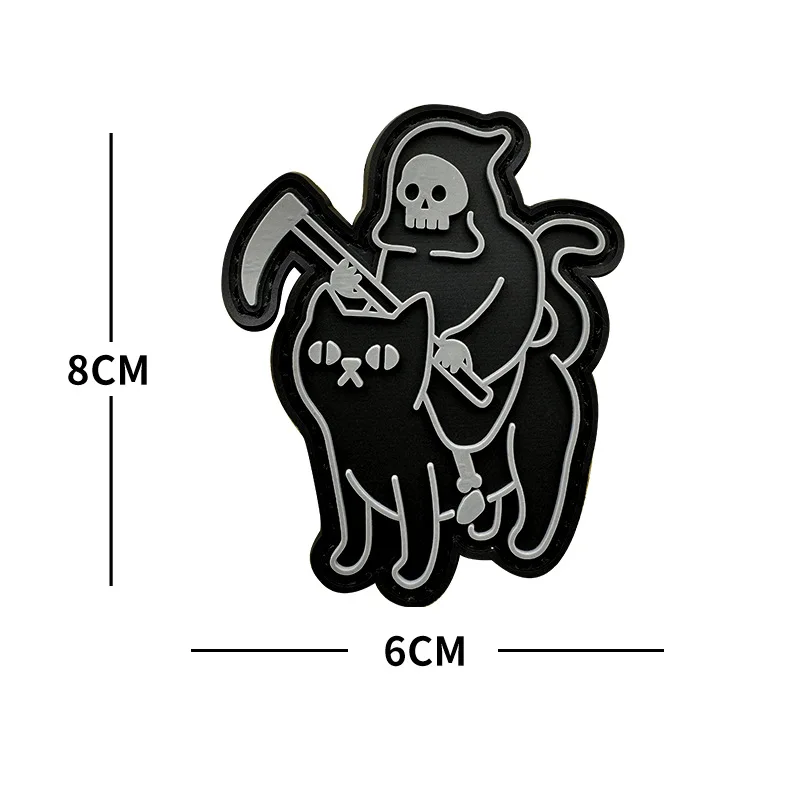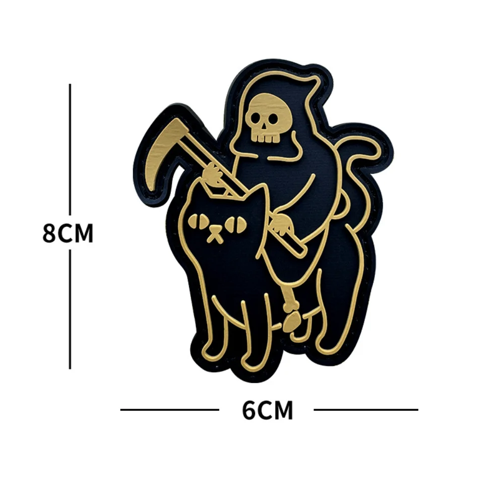 Enhance your gear with this unisex PVC and soft rubber patch measuring 2.36″ by 3.15″, featuring a playful Grim Reaper riding a cat motif in a bold, cartoonish style. Available in antique zinc, antique silver, antique brass, and antique copper, this eco-friendly, embroidered patch boasts a durable 3D design with luminous glow-in-the-dark options. Equipped with a hook and loop fastener, it easily attaches to jackets, backpacks, hats, helmets, or DIY clothing, and can be sewn for extra durability. Perfect for tactical, decorative, or collectible use, it adds a striking, whimsical touch to any accessory.