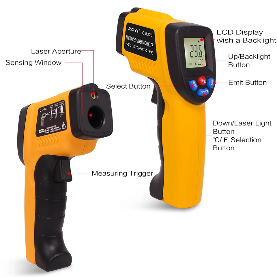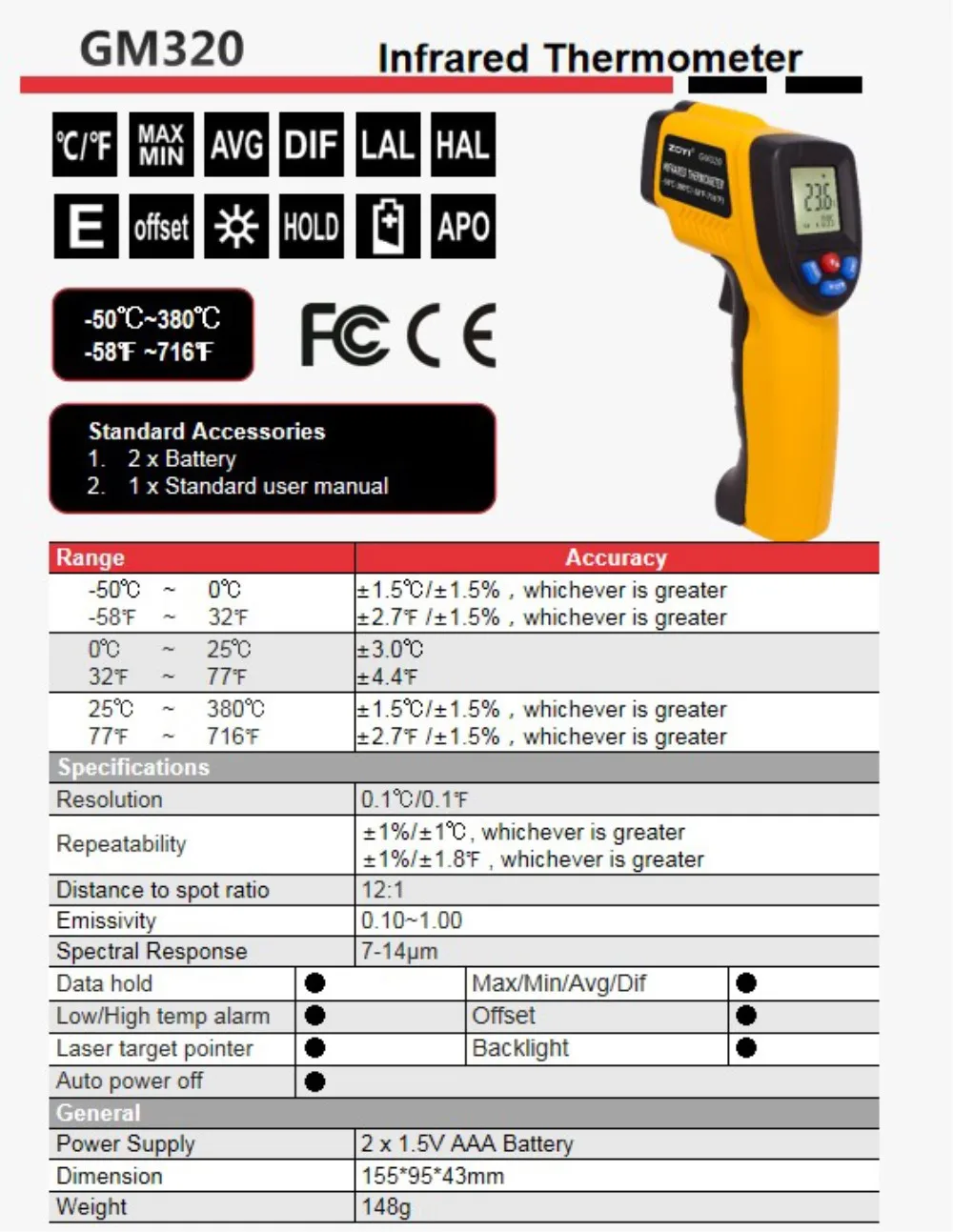 - Powered by AAA batteries (not included), featuring automatic shutdown to extend battery life, an over-temperature alarm to warn of critical measurements, and stable infrared technology for consistent results.