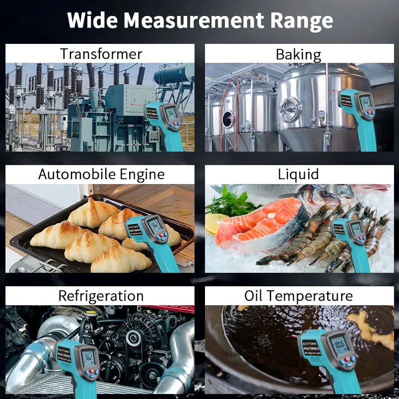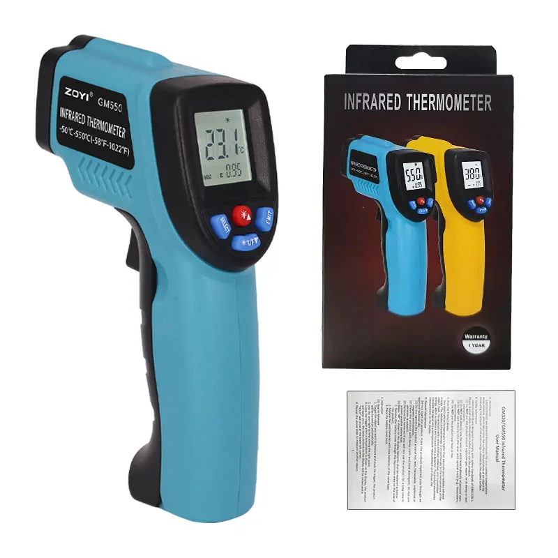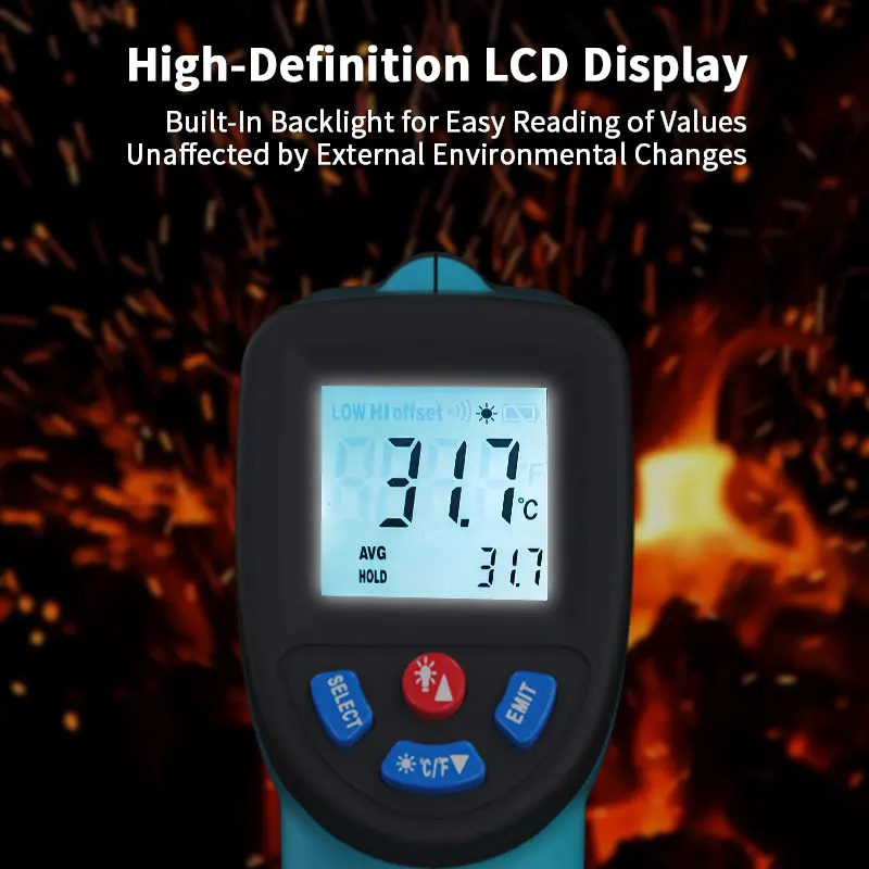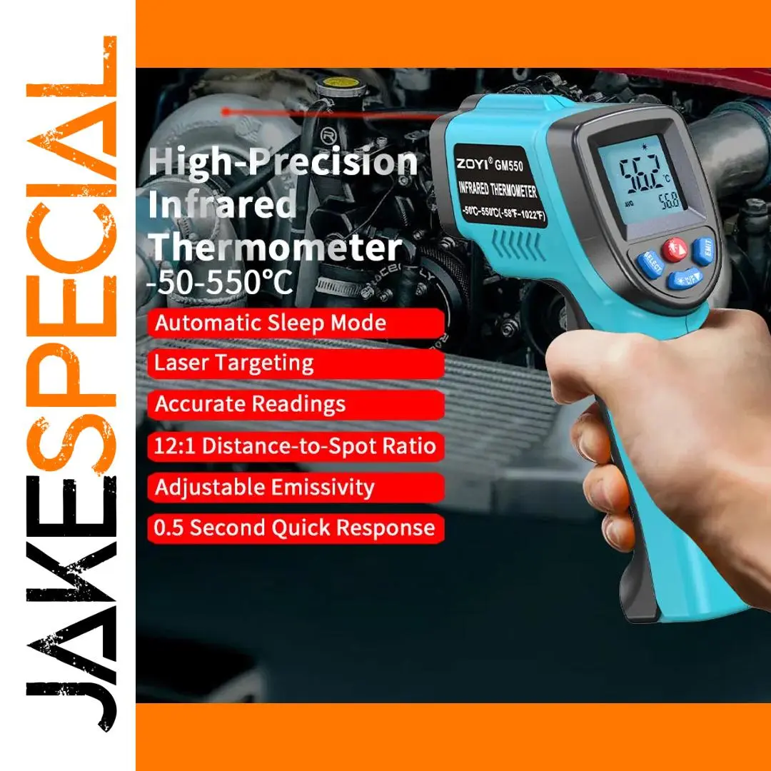 Experience precise temperature measurement with this high-precision infrared thermometer, featuring a sleek blue design and a black front panel around the illuminated display. Its ergonomic pistol-grip shape offers comfortable handling, complemented by colorful control buttons for easy navigation. With a temperature range from -50°C to 550°C, 12:1 distance-to-spot ratio, and adjustable emissivity, it is ideal for industrial and kitchen use, including baking and oil temperature detection. The device boasts a quick 0.5-second response time, laser targeting for accuracy, and automatic sleep mode to conserve energy, providing you with reliable, instant readings in a compact, modern package.