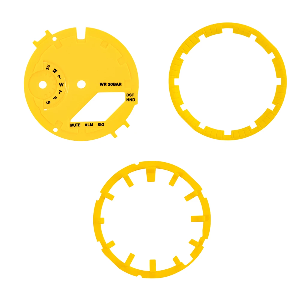 Transform your GMA-S2100 series watch with this premium DIY accessory set, designed for customization and enhanced style. Crafted from durable plastic, it includes three interconnected parts that allow you to personalize your watch face with ease. The main dial features a sleek matte black finish, with precise cutouts and labels for days of the week, alarm indicators, and water resistance markings—giving your watch a highly technical, modern appearance. The two adjustable rings offer layered, industrial aesthetics, with evenly spaced notches for a functional yet stylish look. Available in various eye-catching colors, this set is perfect for individual style expression and making your watch truly unique.
