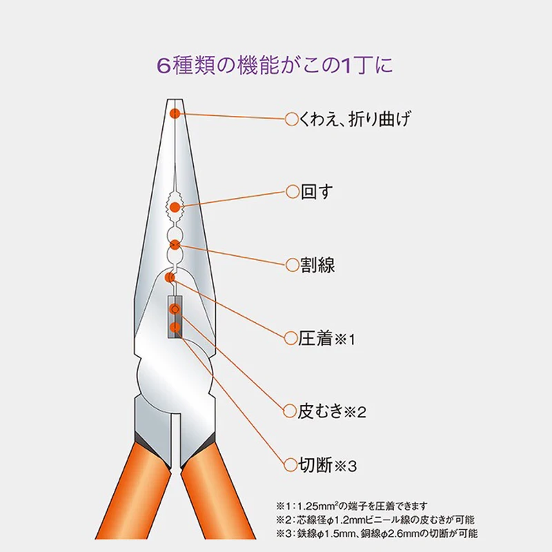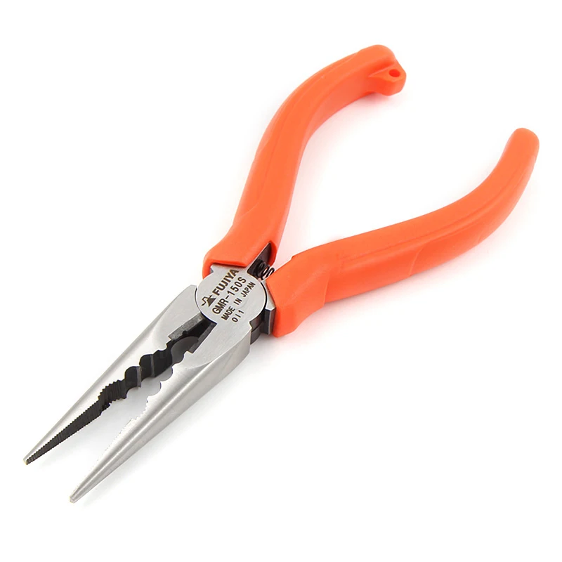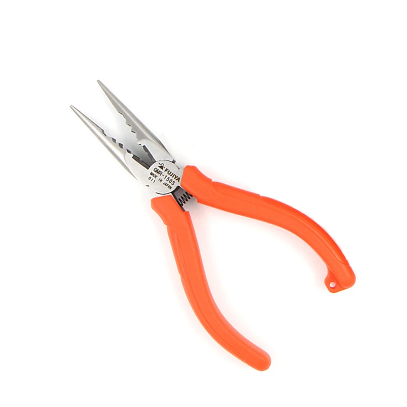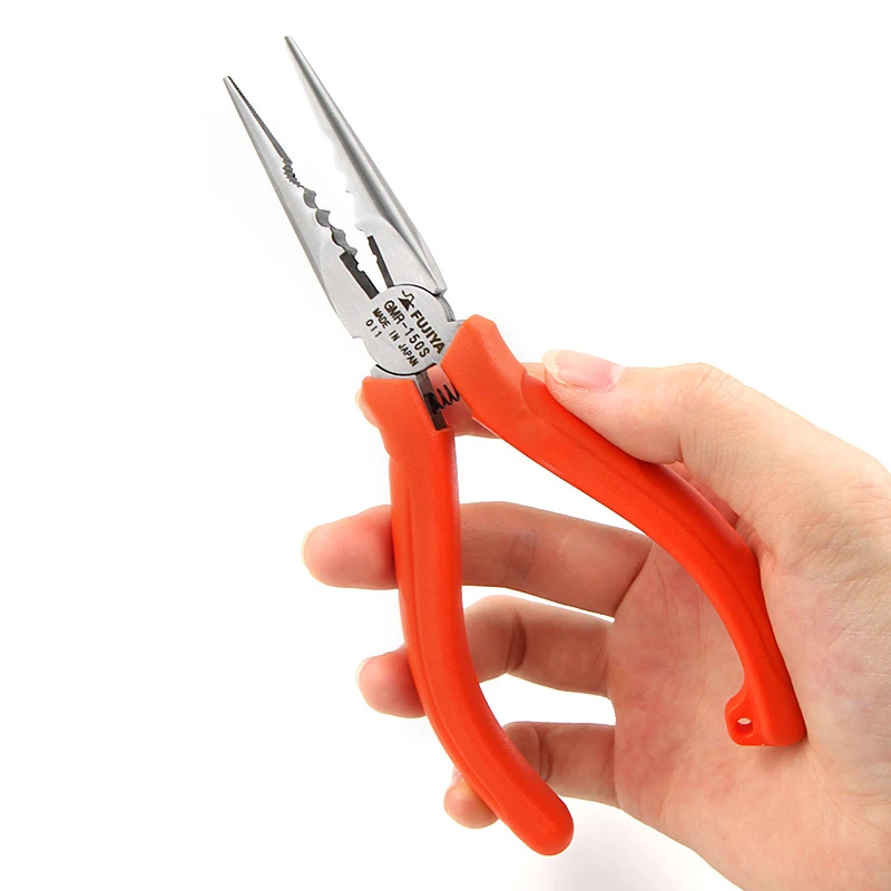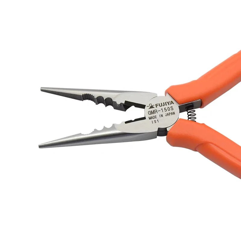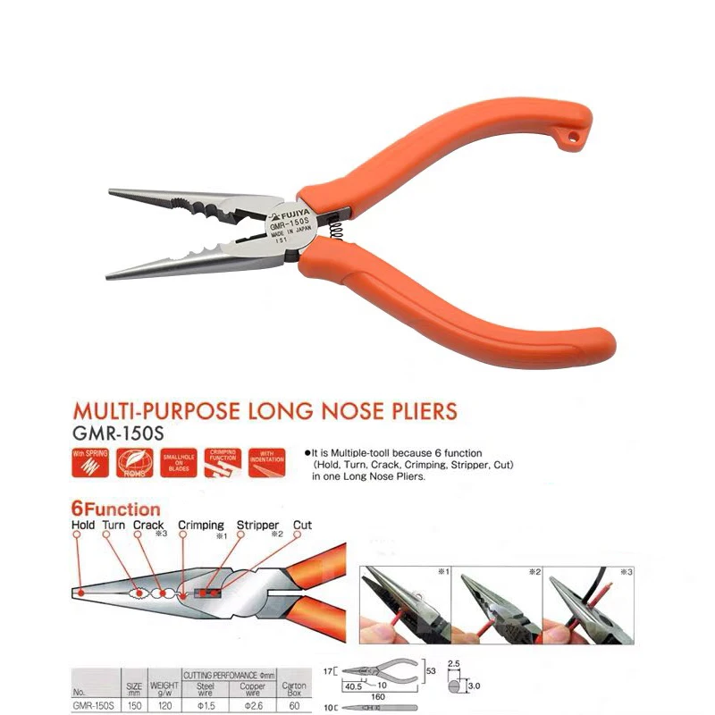Experience the versatility and precision of these Japanese-made FUJIYA GMR-150S multi-functional long nose pliers, designed for electrical and DIY projects. Crafted from durable carbon steel, they feature a bent handle for ergonomic comfort and flexibility. The sleek, silver-colored jaws taper to pointed tips, with textured grooves and serrated teeth for secure gripping, cutting, stripping, and crimping. Capable of shearing steel wire up to 1.5mm diameter and copper wire up to 2.6mm diameter, this six-function multitool is ideal for professional electricians and DIY enthusiasts seeking reliability and efficiency in one compact tool.
