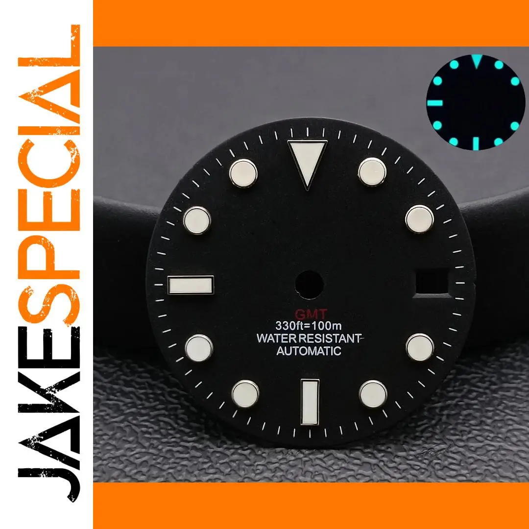Elevate your watch project with this 28.5mm GMT black watch dial, compatible with NH34 and NH35 movements. Its striking matte black finish features bold white hour markers and a striking triangular 12 o’clock marker, ensuring exceptional time readability. Highlighted in red, the “GMT” text complements the watch’s functional design, while luminous capabilities provide visibility in low-light conditions, glowing in a captivating turquoise. Whether for crafting a new timepiece or updating an existing one, this dial brings a blend of style and precision, making it an essential choice for horology enthusiasts. Transform your collection today!