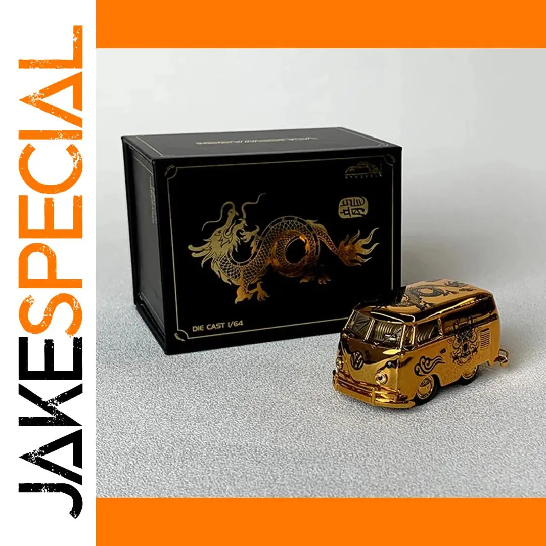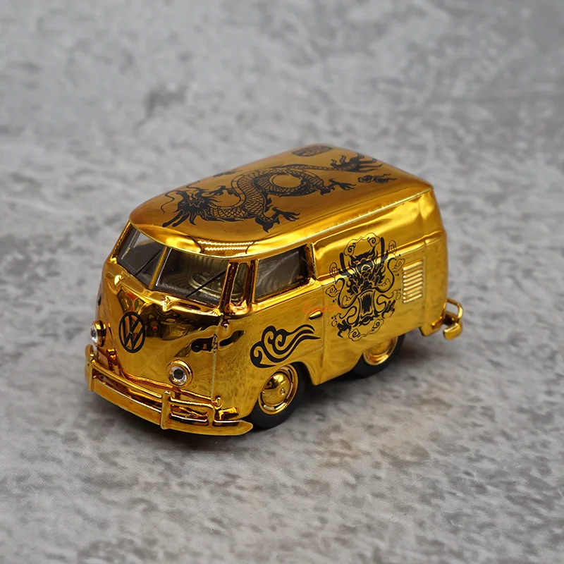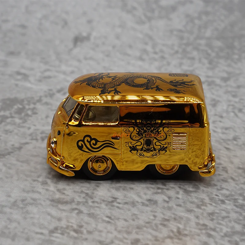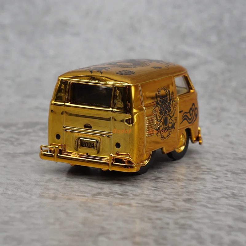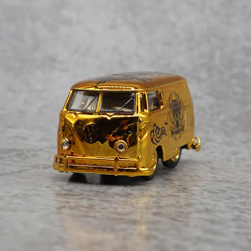 Experience a sense of nostalgia and luxury with this meticulously crafted diecast model of the 1960 Volkswagen Type 2 (Bus). Finished in a striking, reflective gold color, this 1:64 scale replica exudes sophistication and attention to detail. Its rounded body features classic design elements such as a sloped front windshield, tiny circular headlights, and a subtle front grille. Decorated with intricate black graphic motifs on the sides, it provides a beautiful contrast against the gold surface. The transparent or painted windows, along with detailed windshield wipers and small side mirrors, enhance its realism. Black wheels with silver hubcaps and textured tires round out the authentic look. Perfect for display or collection, this model captures the vintage charm with luxurious refinement.