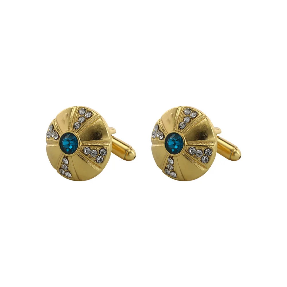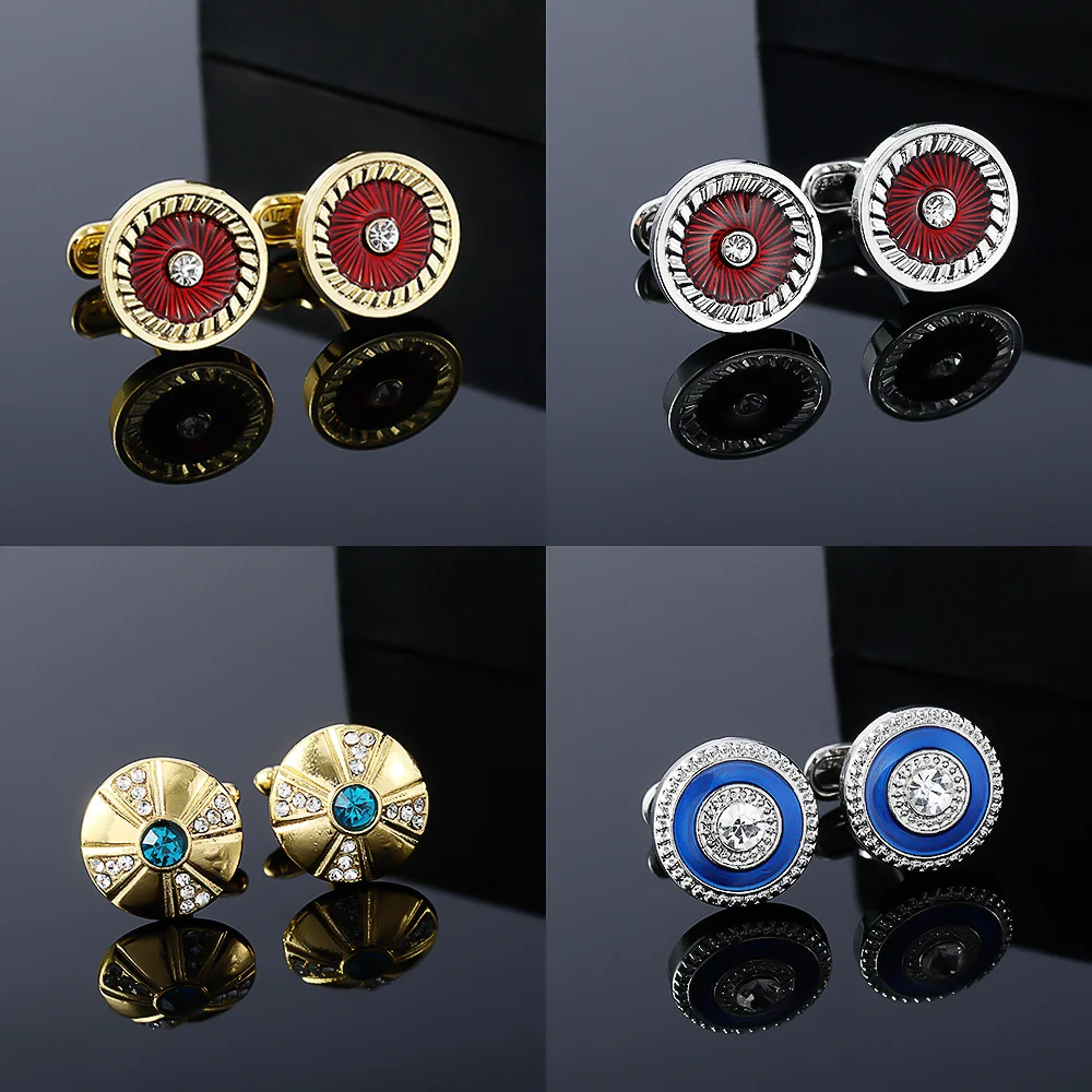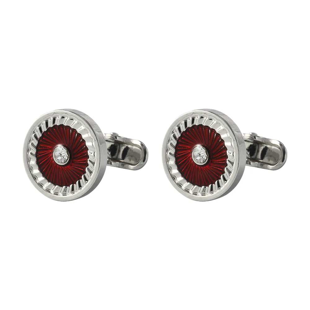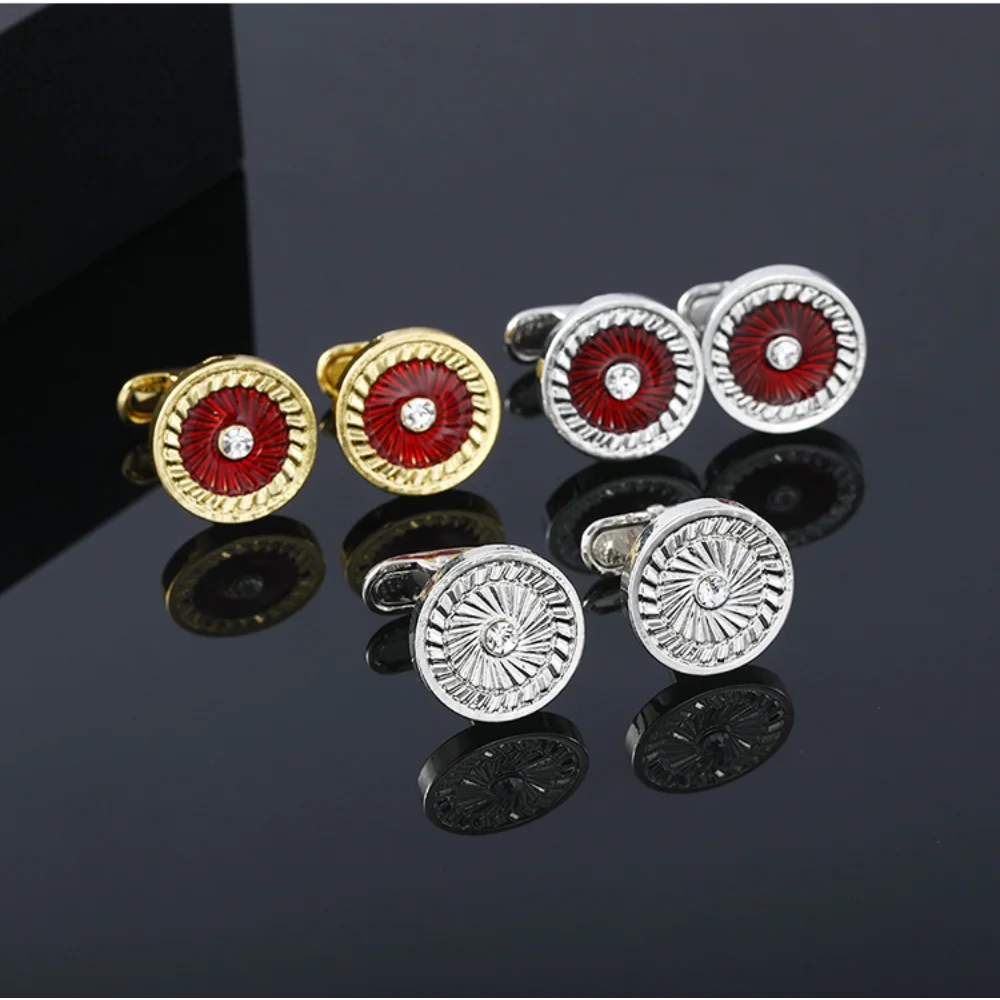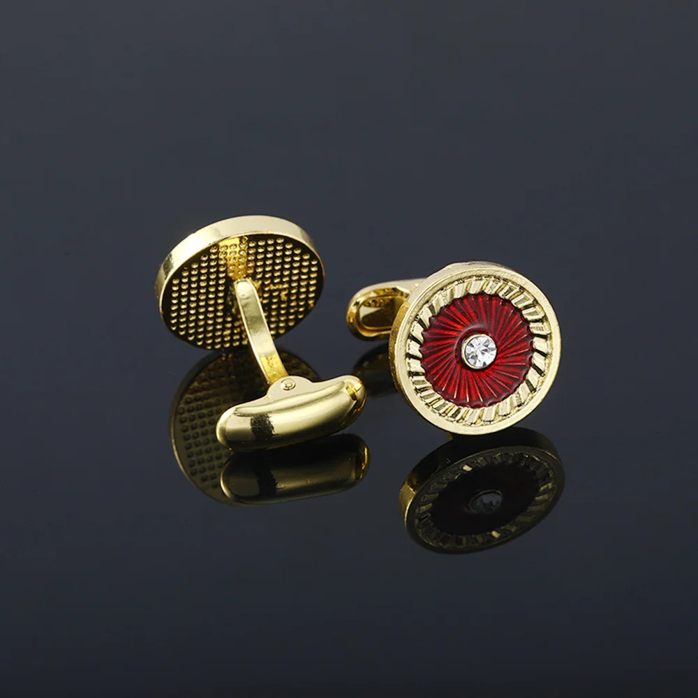 Step into sophistication with this pair of men's cufflinks featuring a luxurious gold-tone finish. The circular face is adorned with a vibrant red enamel center, radiating outward with finely detailed, raised lines that form a striking sunburst or fan pattern. At the core of each cufflink, a sparkling gemstone adds a touch of brilliance, contrasting beautifully against the red and gold. The outer edge is subtly ridged, enhancing texture and visual depth. Versatile and stylish, these cufflinks elevate your formal attire or casual accessories, making you stand out with their refined yet bold aesthetic. Perfect for weddings, banquets, or adding a touch of elegance to your daily wardrobe, they truly embody timeless craftsmanship and style.