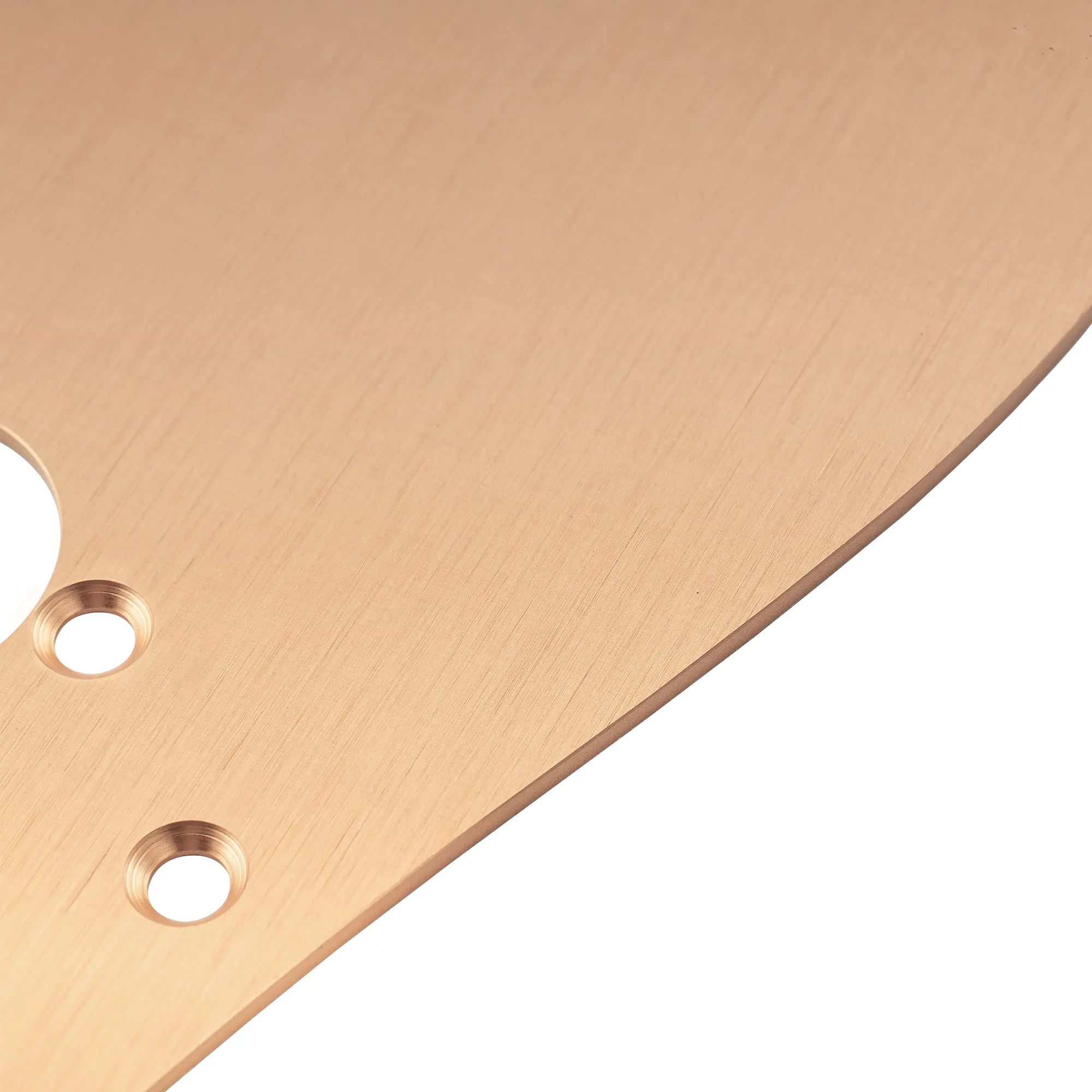Experience a refined vintage aesthetic with this gold anodized aluminum guitar pickguard designed specifically for pre-2019 vintage-style Stratocaster electric guitars. Its sleek brushed metal finish, combined with a smooth, slightly asymmetrical outline, elevates the classic '50s Strat look, adding warmth and elegance to your instrument. The pickguard's 1.5mm thickness offers durability without excess weight, while softly rounded edges provide comfort during play. Perfectly machined with precision digital CNC technology, it ensures excellent fit and longevity. Whether you're restoring a vintage model or customizing your guitar, this pickguard enhances the instrument’s visual appeal and performance, making it an essential upgrade for serious enthusiasts and collectors alike.