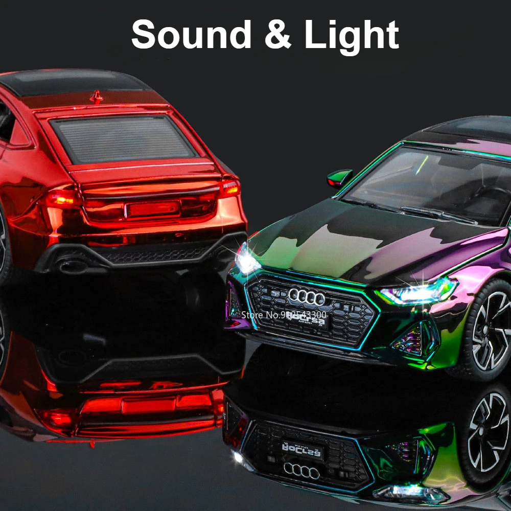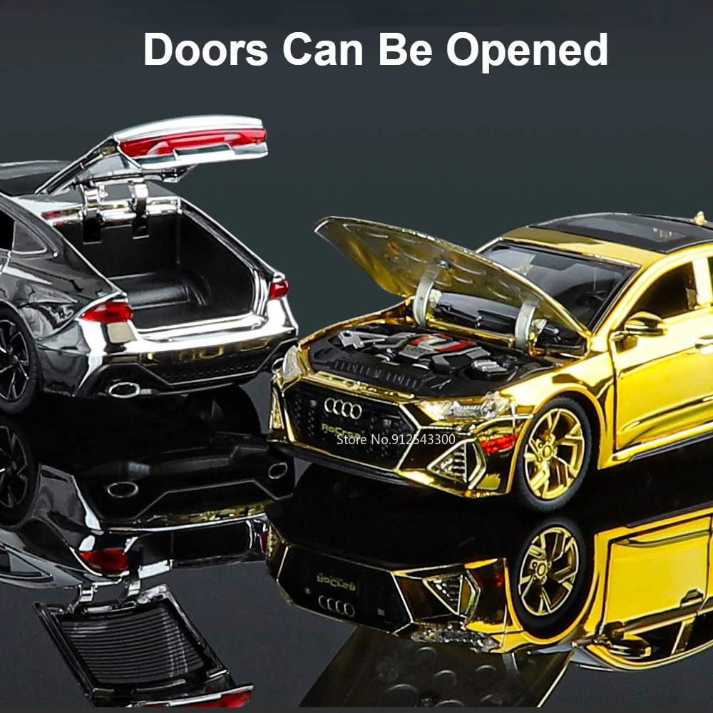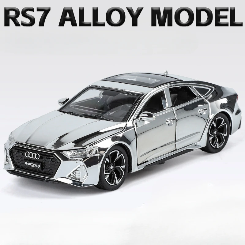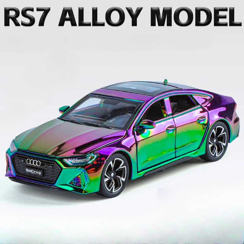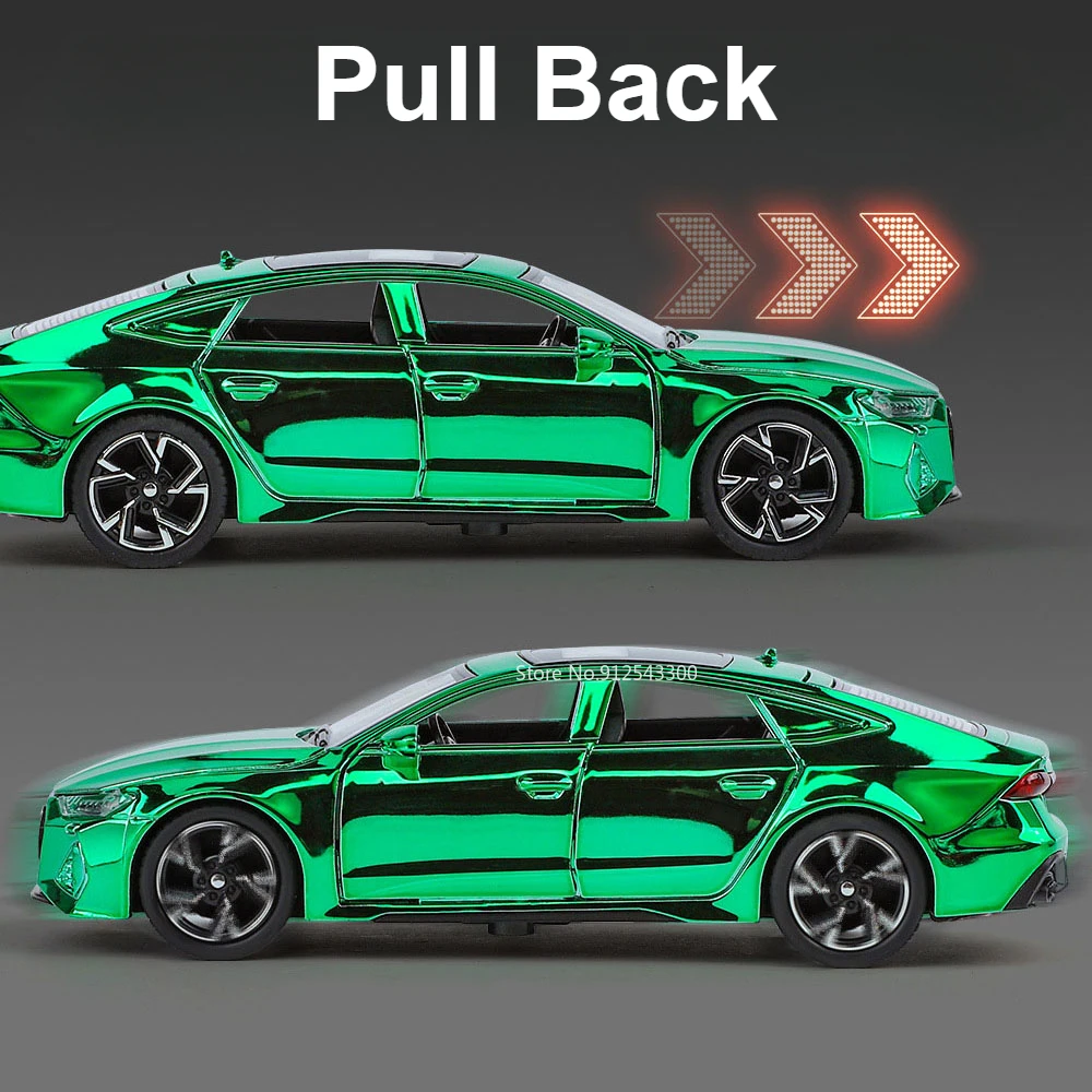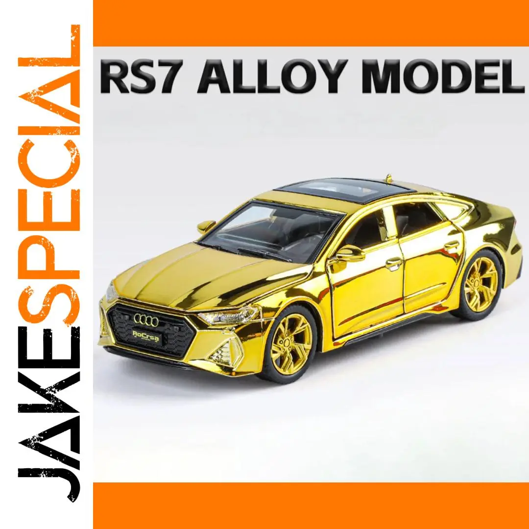 Experience the luxury and sporty elegance of the 1:32 scale diecast Audi RS7 model, featuring a highly reflective electroplated gold finish that captures attention with its glossy shine. Crafted with a durable metal body, plastic chassis, and rubber tires, this detailed replica measures approximately 15.5 x 6.5 x 4.5 cm. It boasts realistic features such as opening doors, sound and light effects, a pull-back mechanism, and four-wheel suspension for added authenticity. Available in eye-catching colors like green, red, purple, silver, and track red or white, this collectible is perfect for enthusiasts seeking a combination of style, detail, and fun. Batteries not included.