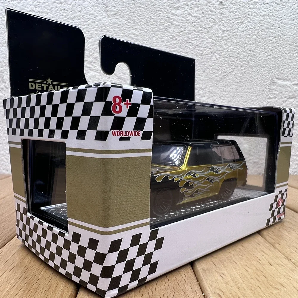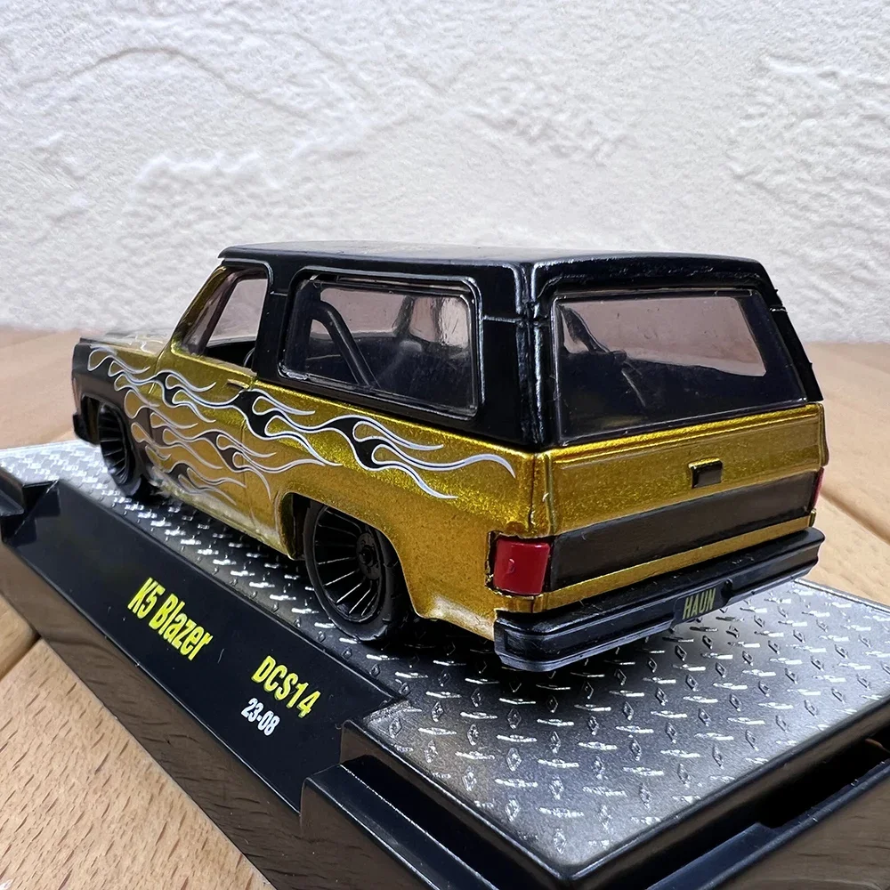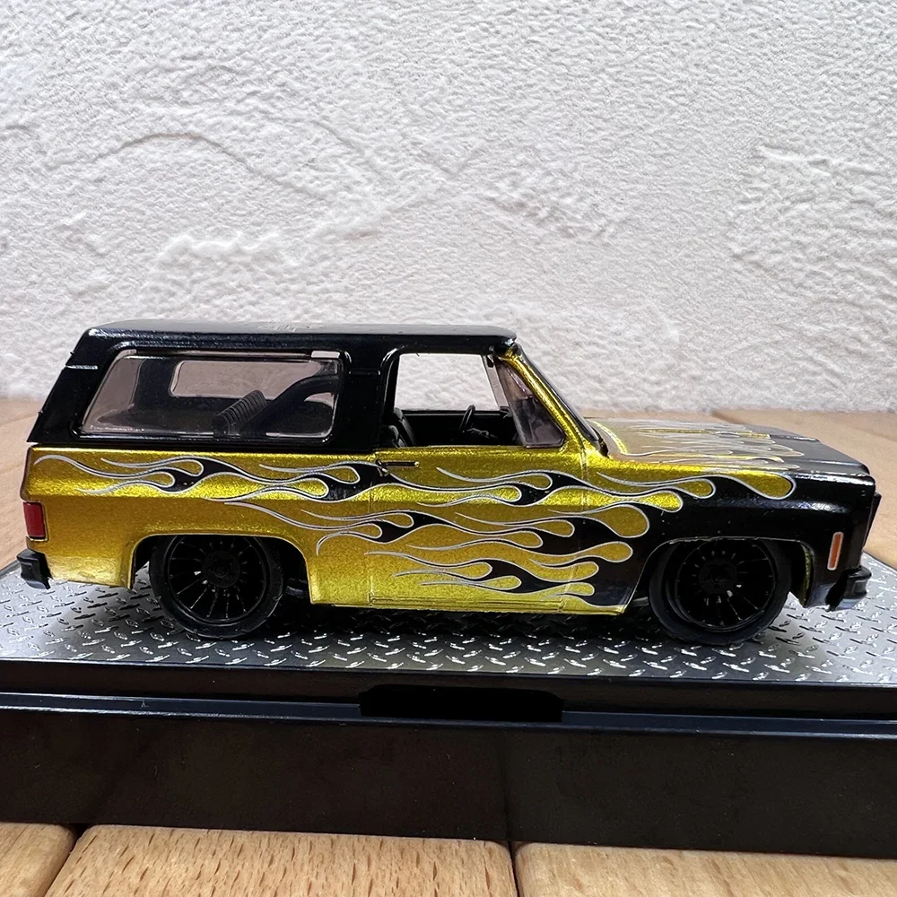 Immerse yourself in the vibrant world of automotive collectibles with this highly detailed miniaturized Chevy K5 Trailblazer Pickup truck. Crafted from alloy and plastic materials, this 1:64 scale model exudes realism through its bold gold body accented with fiery flame decals in white, black, and metallic shades. The textured black front grille and dark for clear headlights add to its authentic appearance. With transparent windows revealing a minimal interior, and black multi-spoke movable wheels, this model perfectly captures the sporty and aggressive look of the original. Its compact size of approximately 7.2 cm long makes it an ideal decorative piece for display, collection, or gifting to fellow enthusiasts. This static model embodies speed and power, making it a true standout in any collection.