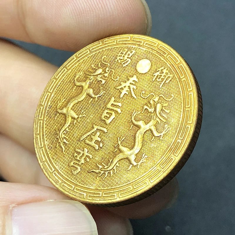 - Round brass medal measuring 28mm in diameter with a polished gold finish. Features a vintage-style design highlighting traditional Chinese dragon motifs and detailed engravings.