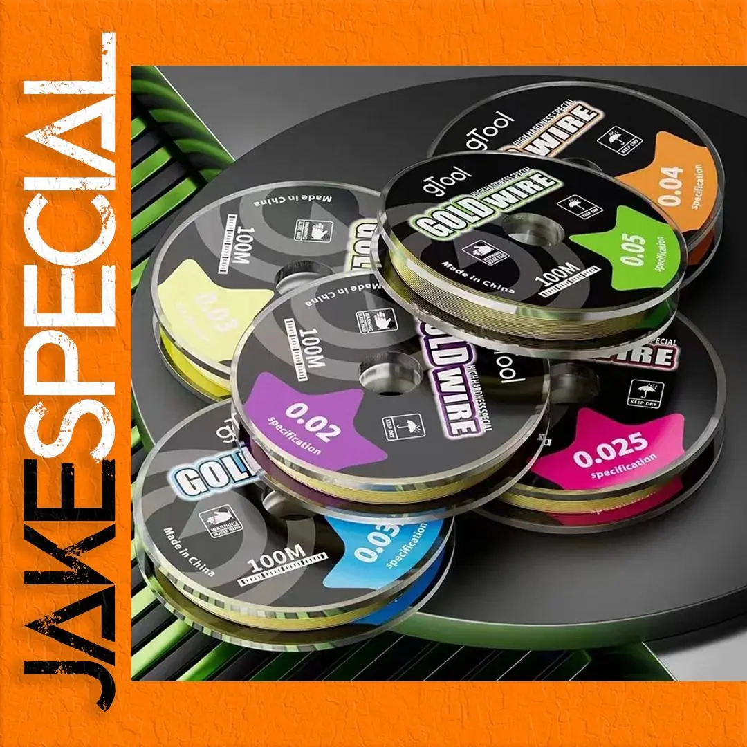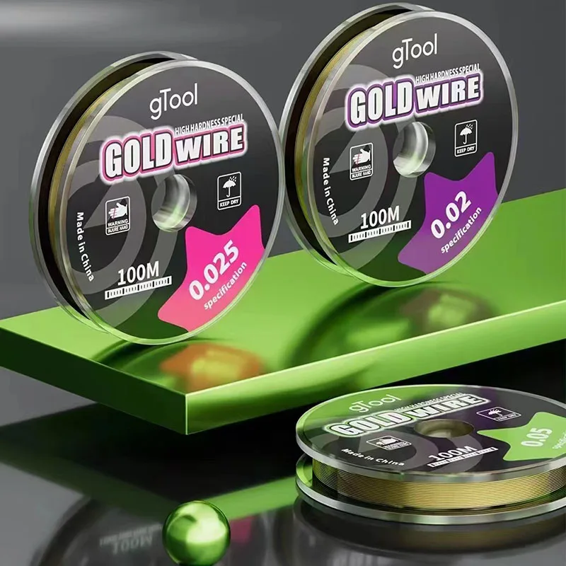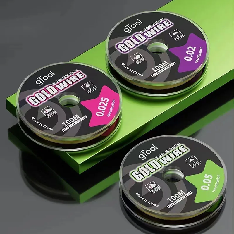 - Gold-coated steel wires wound on sleek black spools measuring 100 meters, ensuring durability, flexibility, and consistent quality for delicate electronic repairs.