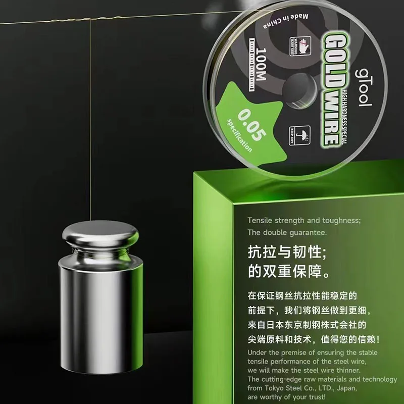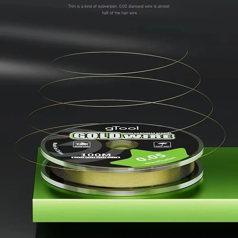 - Technical features include: 100 meters length, diameters ranging from 0.02mm to 0.06mm, gold-plated coating for enhanced cutting performance, and a versatile design for multiple repair scenarios.