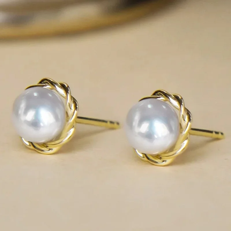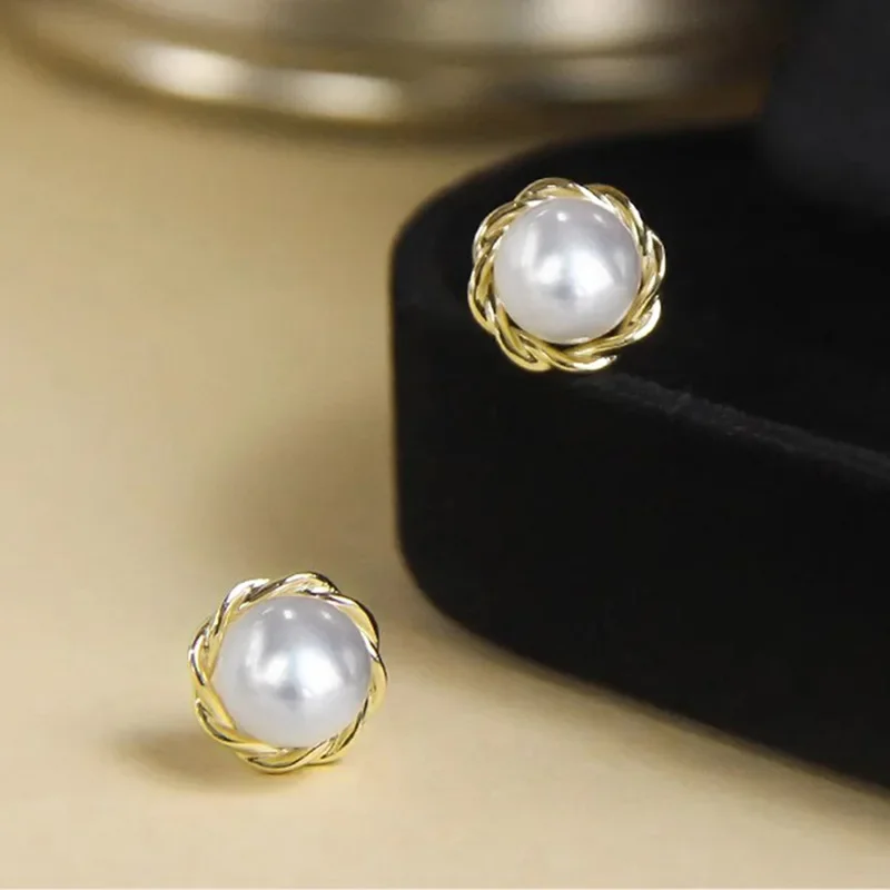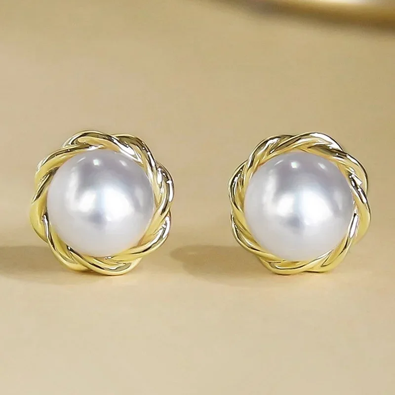- Designed as simple flower-shaped stud earrings with twist rope-like circular frames providing intricate detail and visual interest.